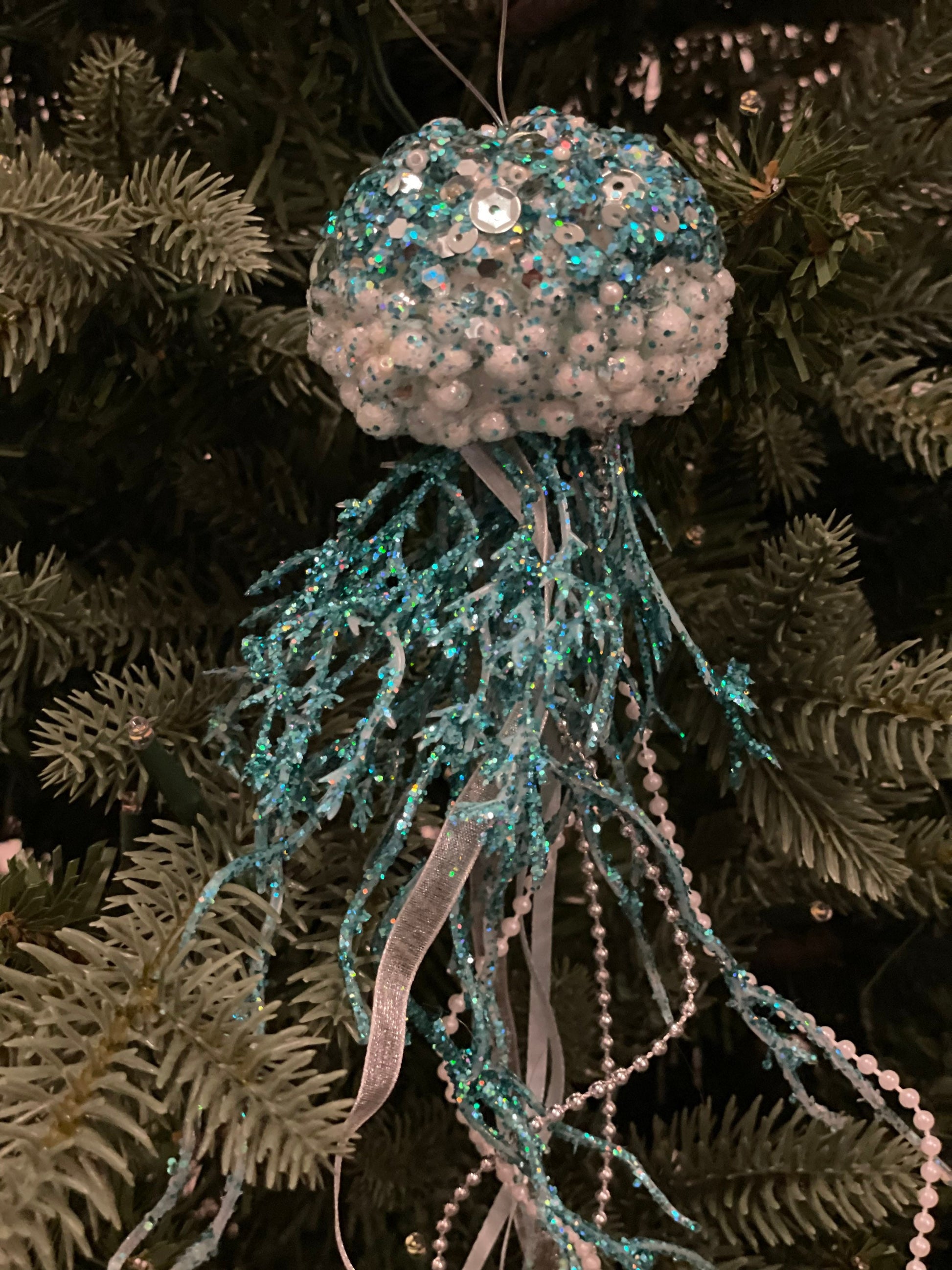 SET of 2. 12"glitter sequins styro jelly fish ornament. Sea or beach theme ornament.