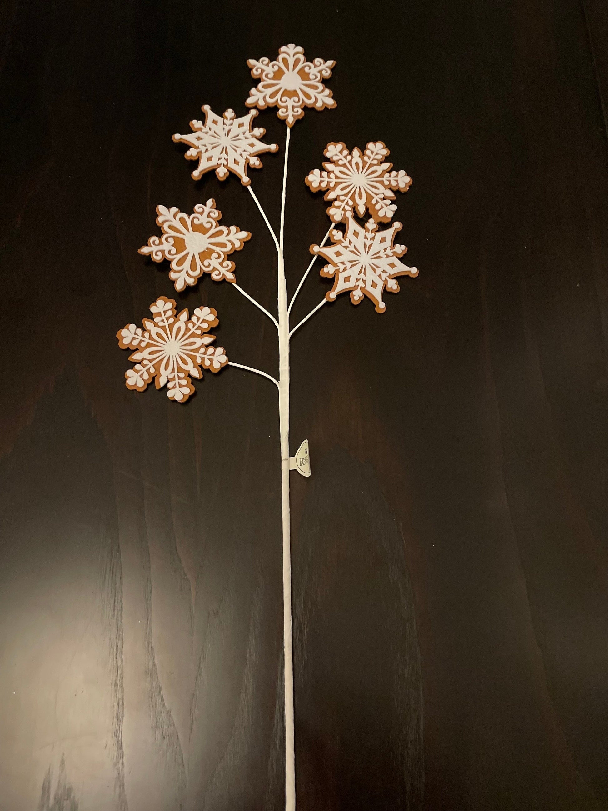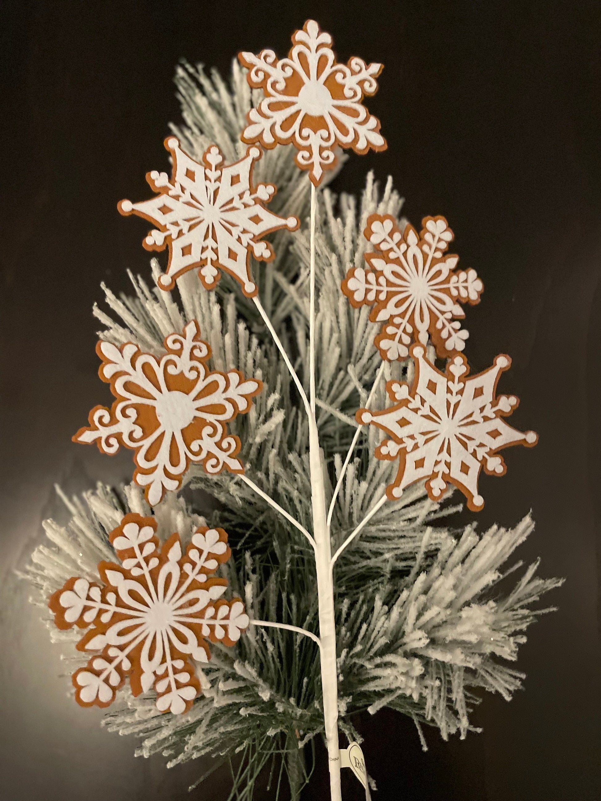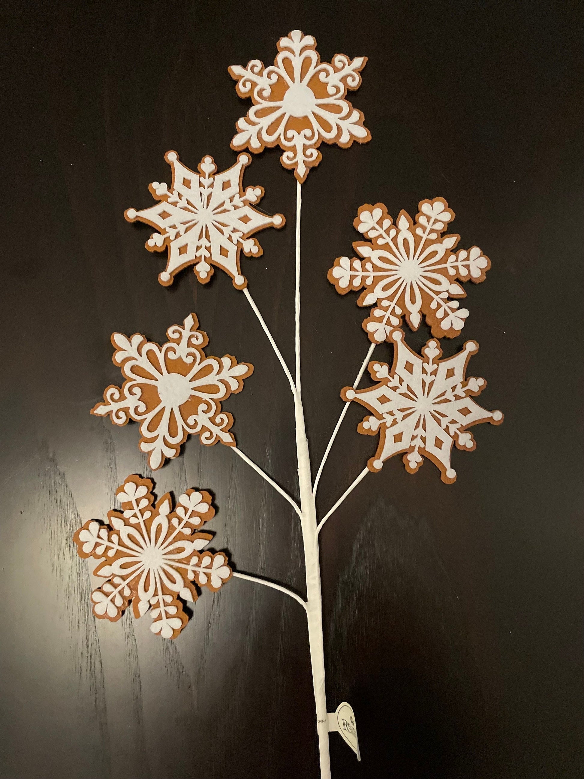 Set of 2. 28” Gingerbread snowflake spray. Perfect for your candy theme decor. This listing is just for the gingerbread spray, the green flocked branch is not included.