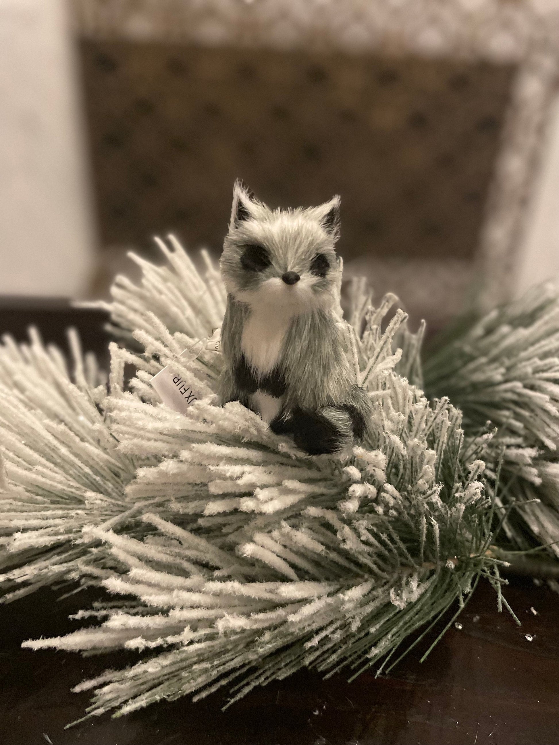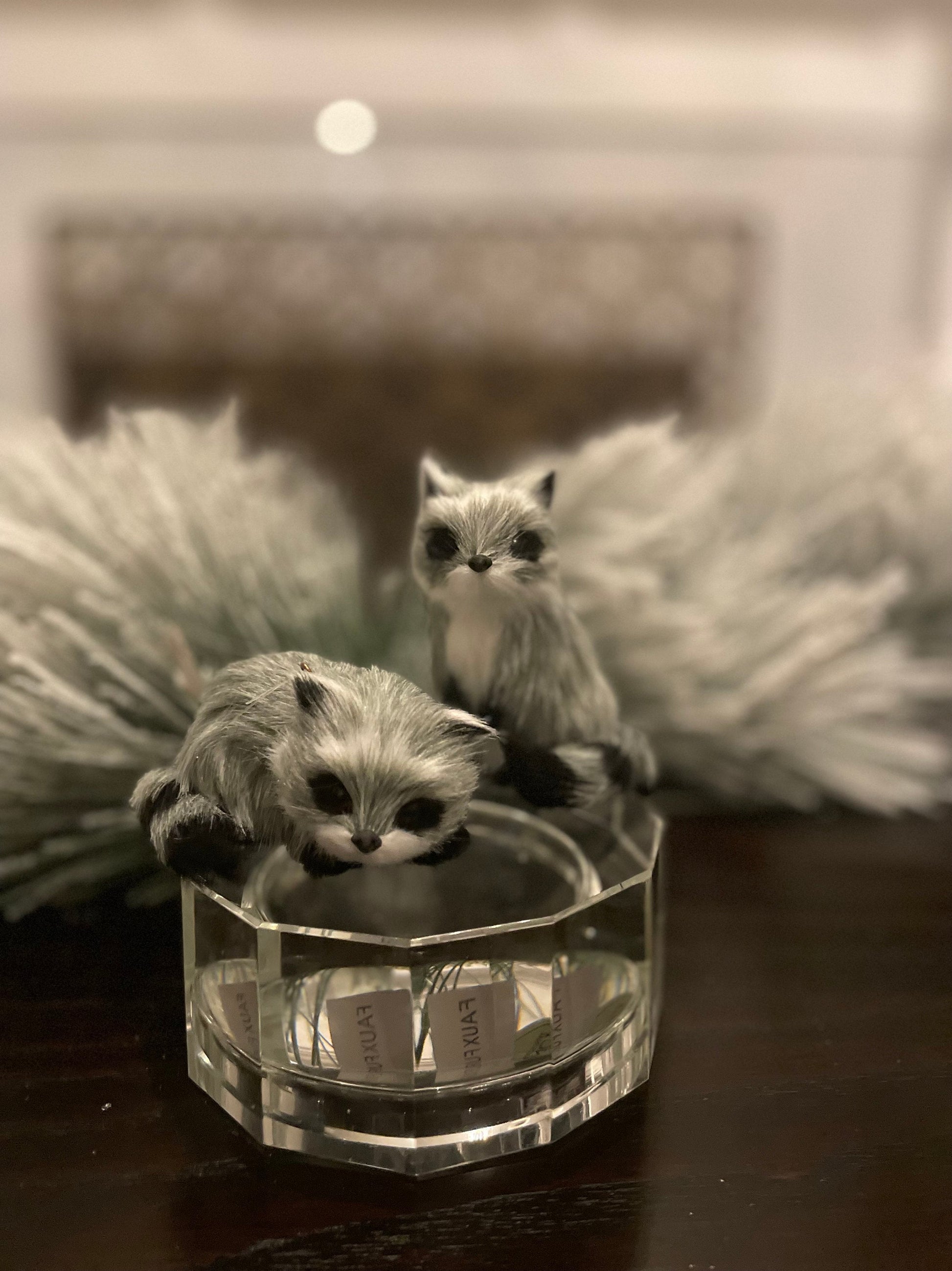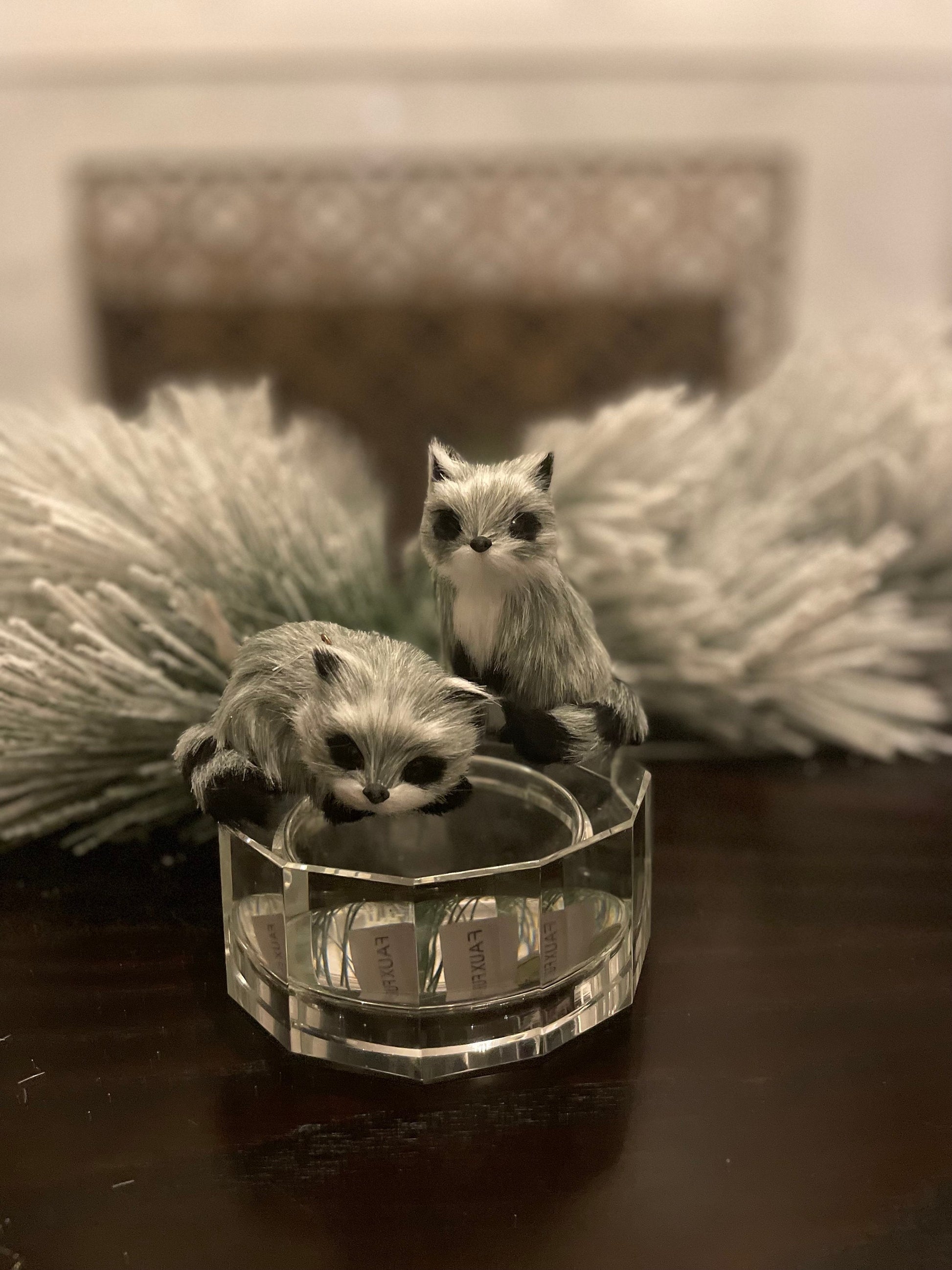 Set of 2. 3.5” furry raccoon ornament. Forest animal.