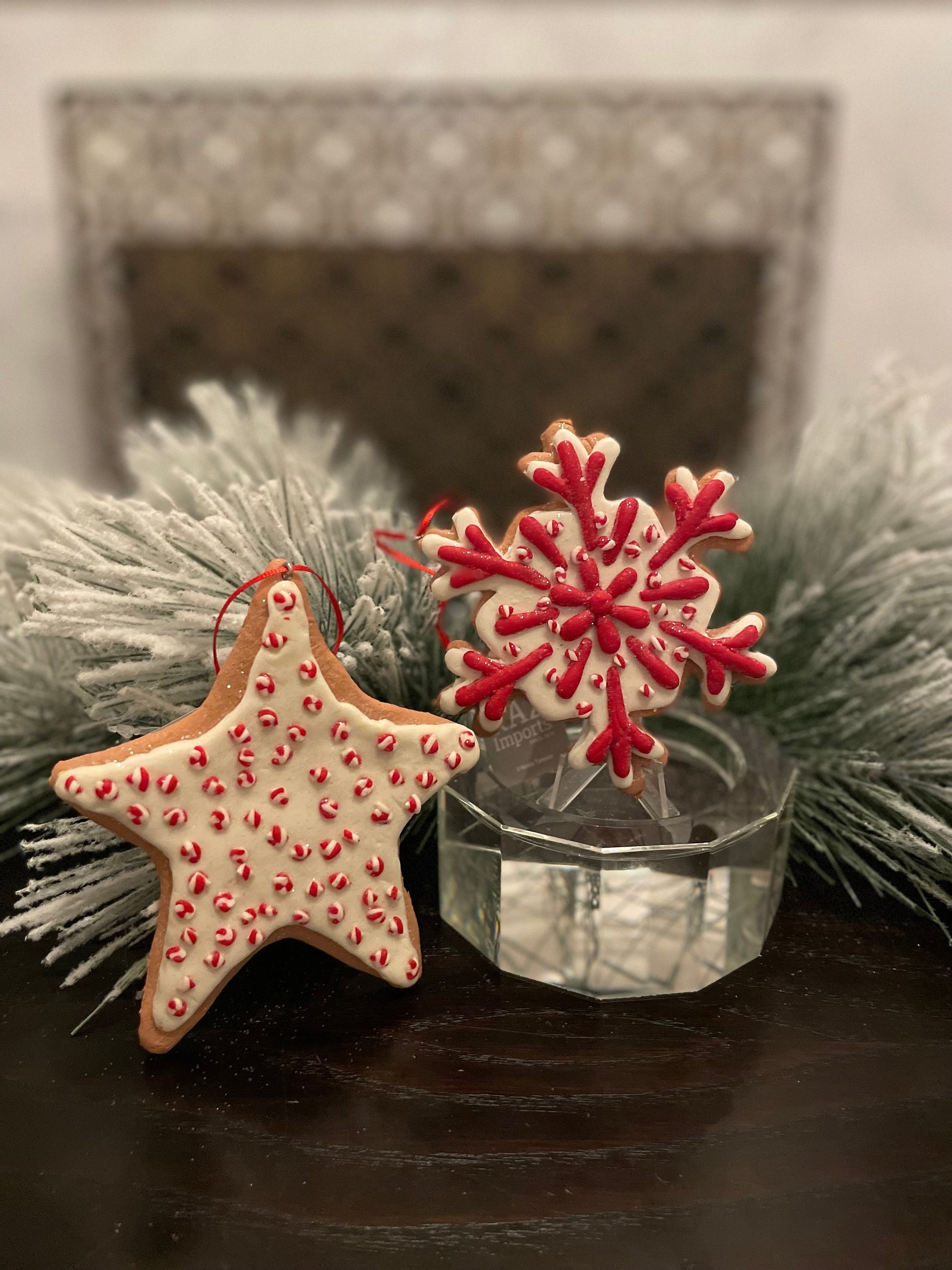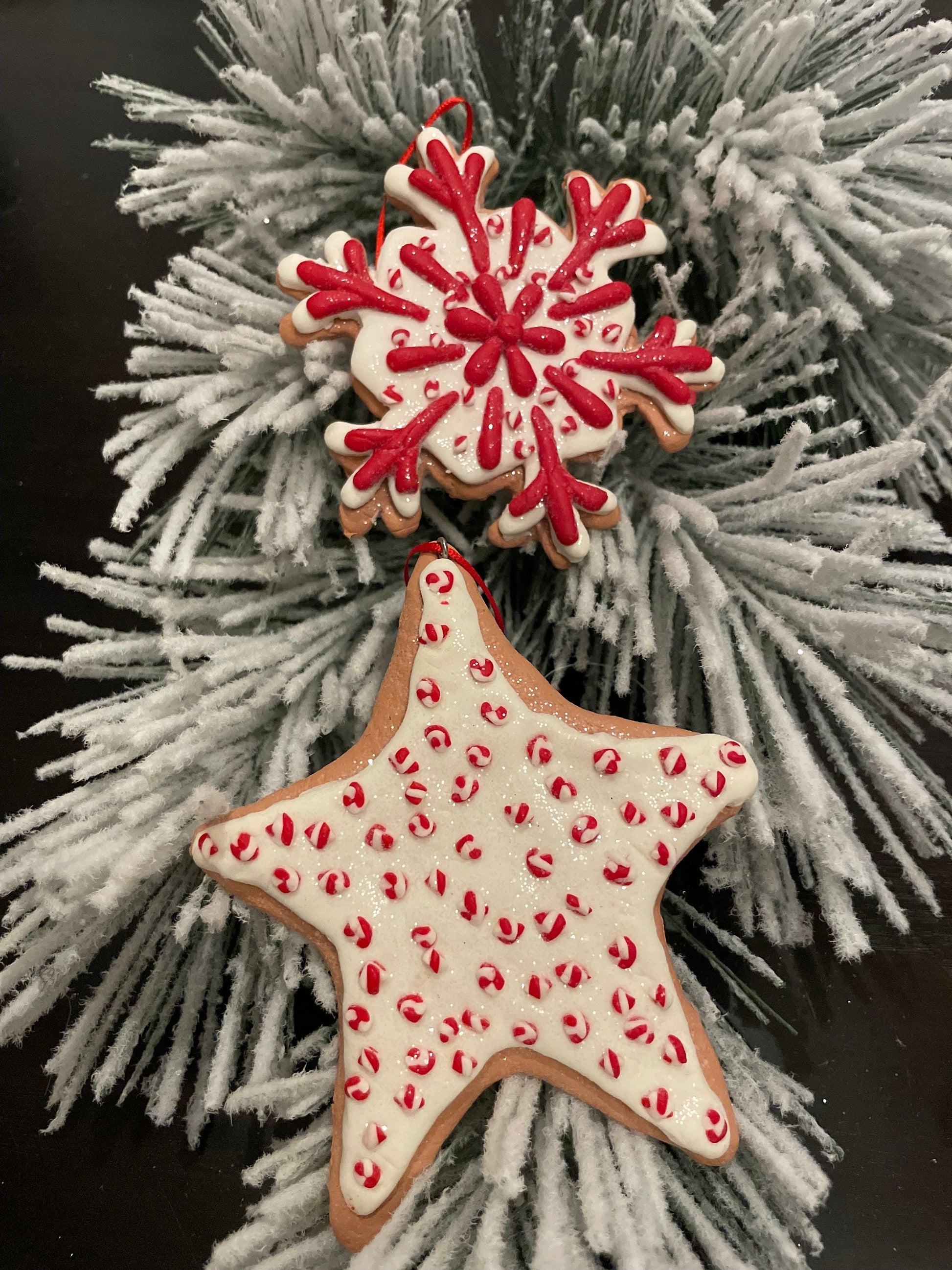 SET of 2. 4.5” Frosty Gingerbread snowflake and star ornament.