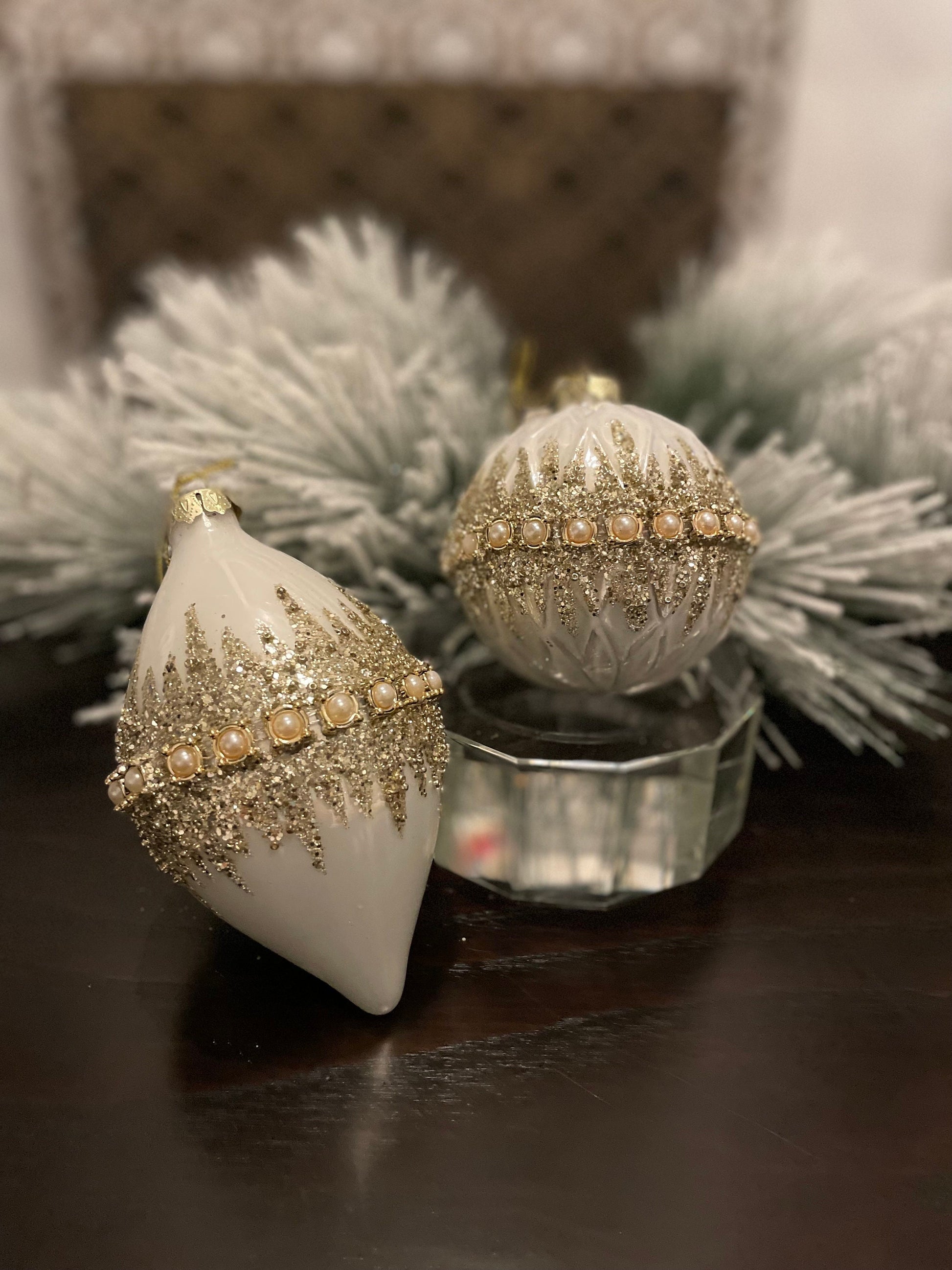 Set of 2. 4”-6" Glass beaded pearl ball/finial ornament. Set of 2. Ivory and gold.