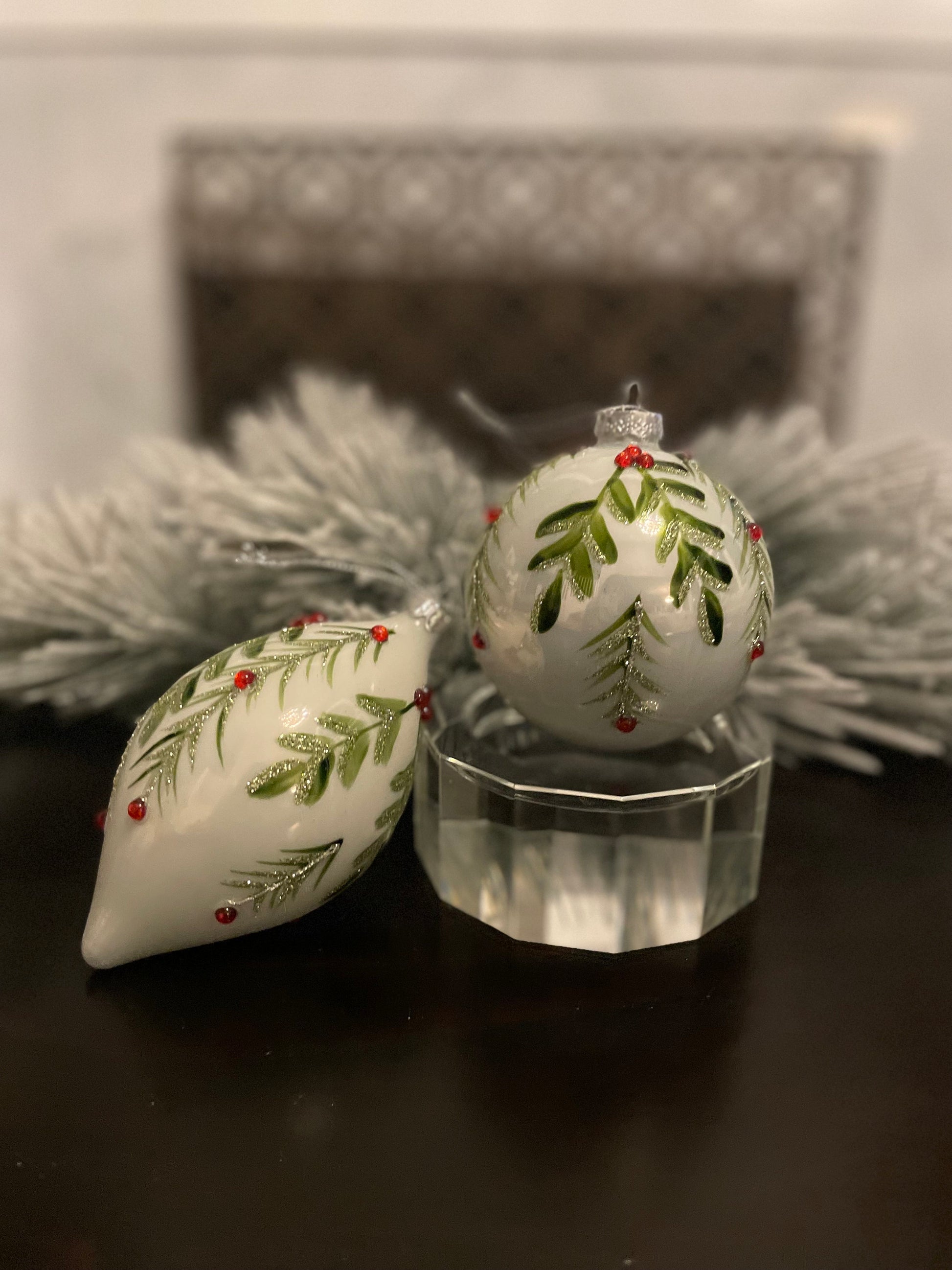 Set of 2. 4”-6” Glass berry/leaf final and ball ornaments. White, green and red.