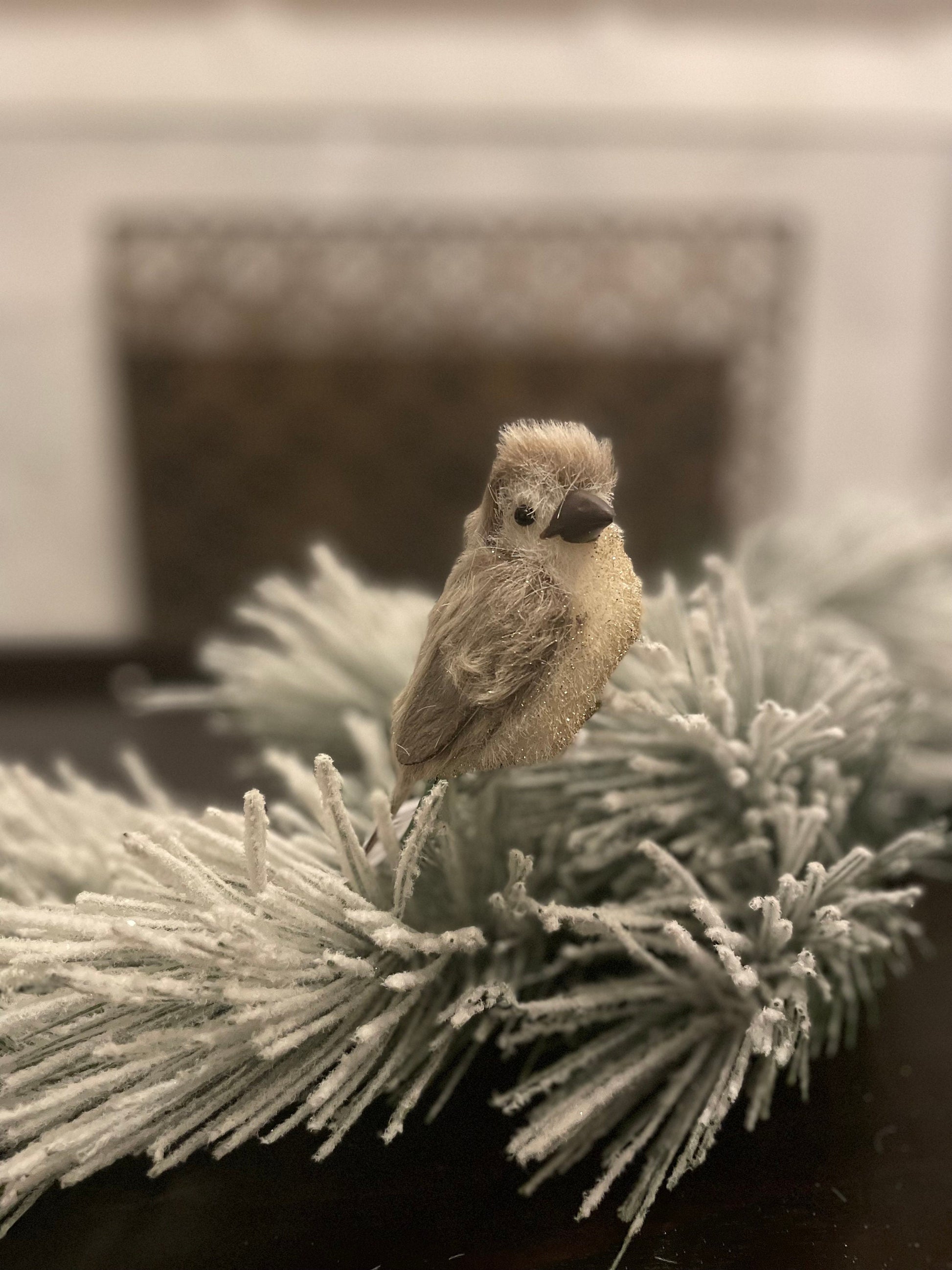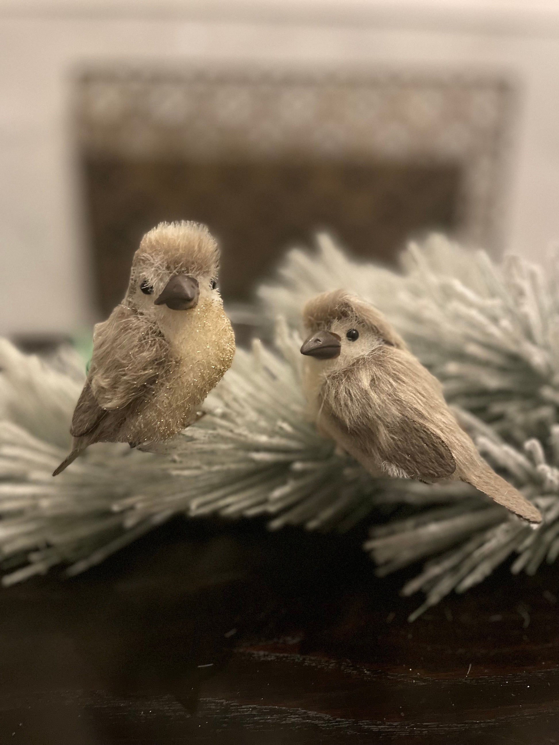 Set of 2. 4” Fabric and faux fur glitter bird clip ornament.