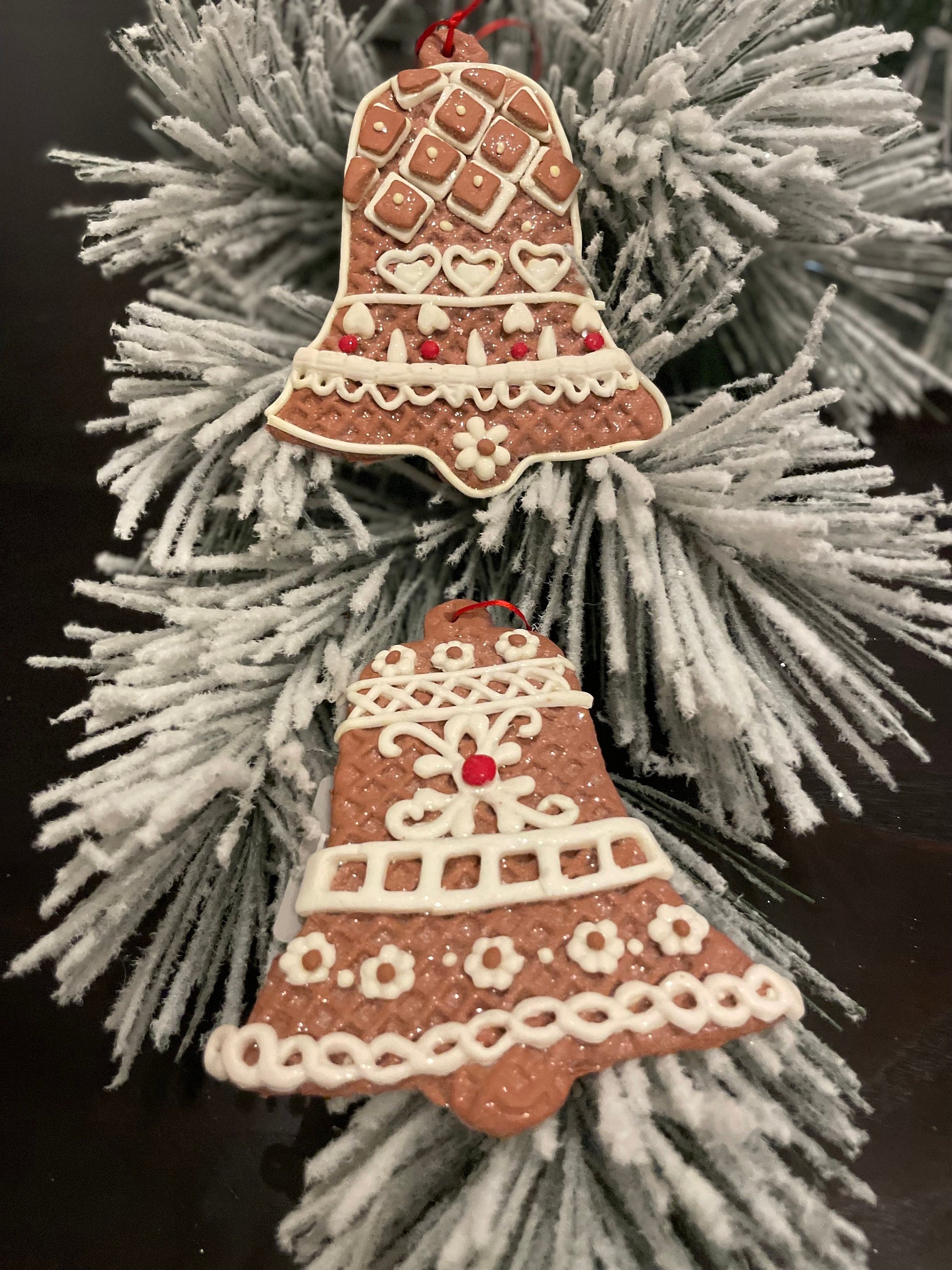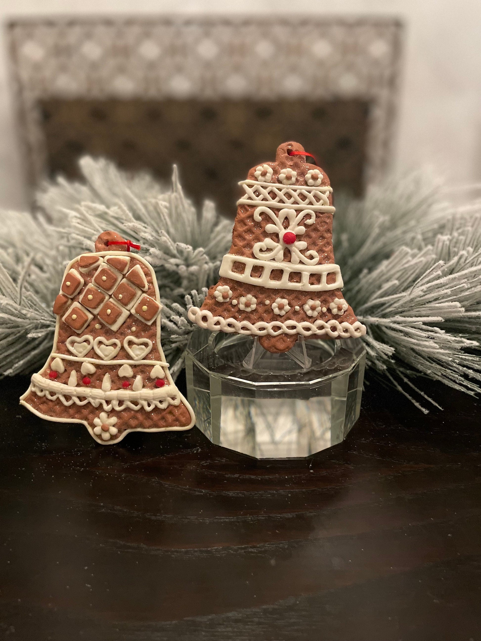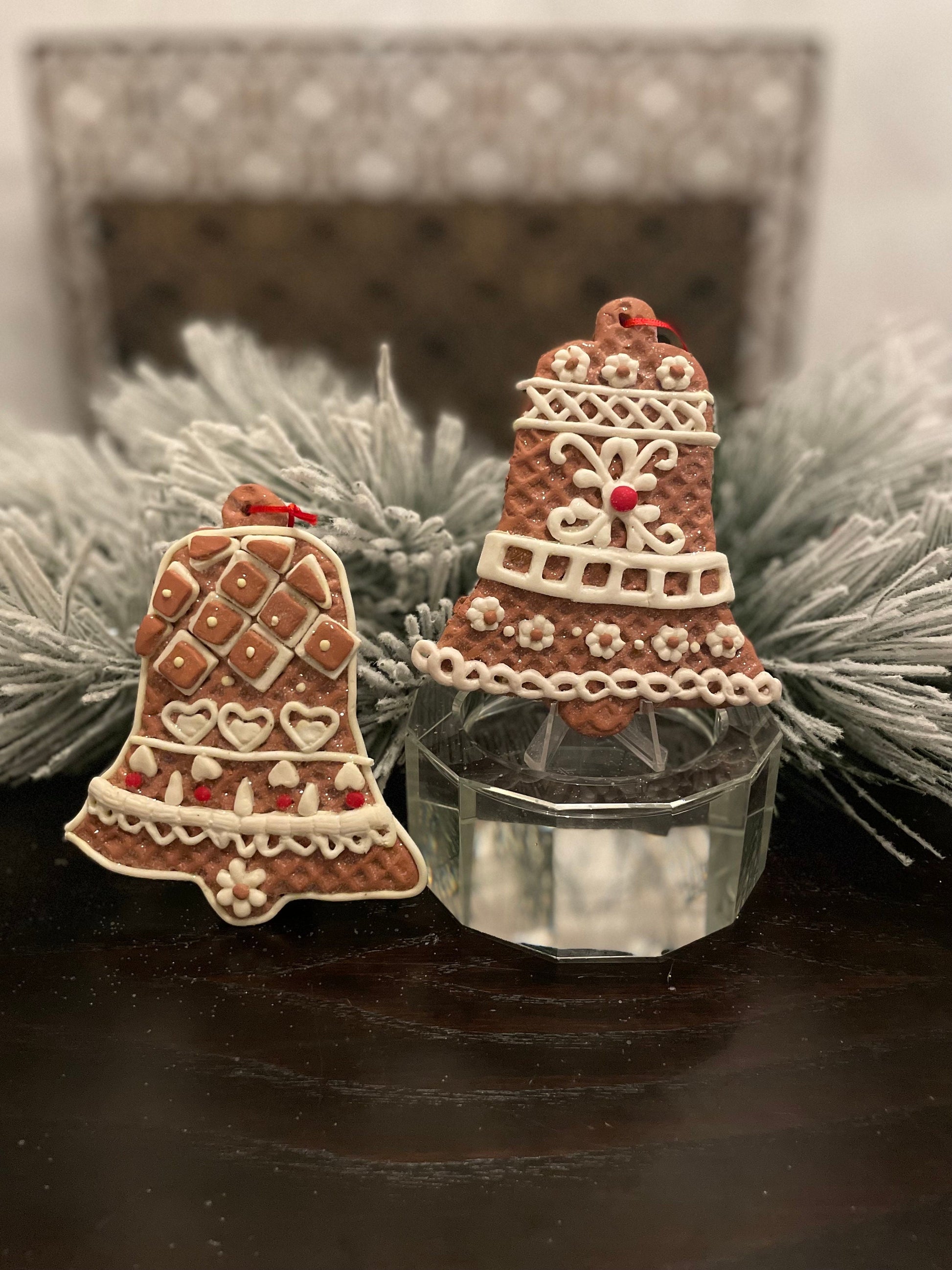SET of 2. 4" Frosty Gingerbread bell ornament.