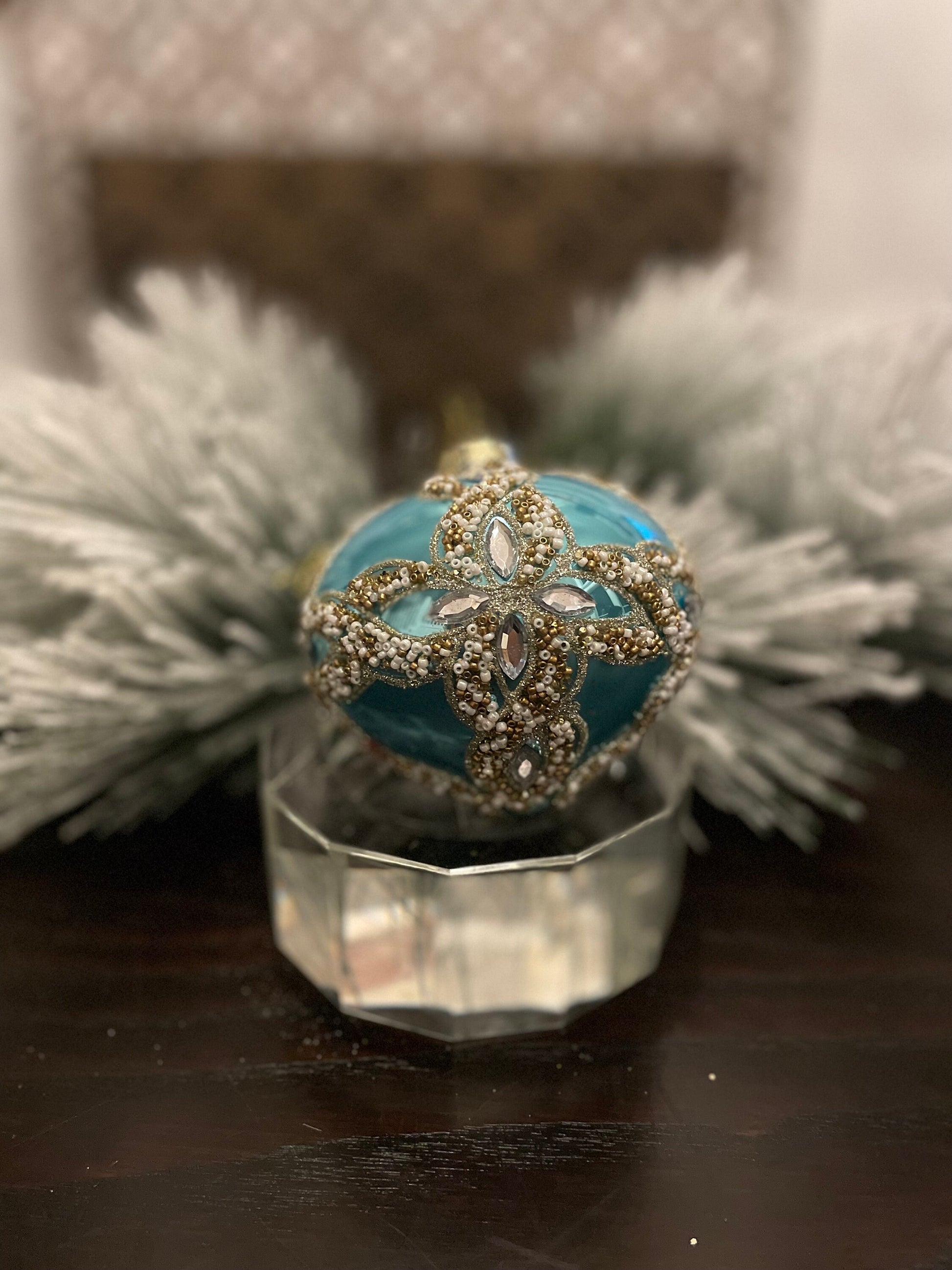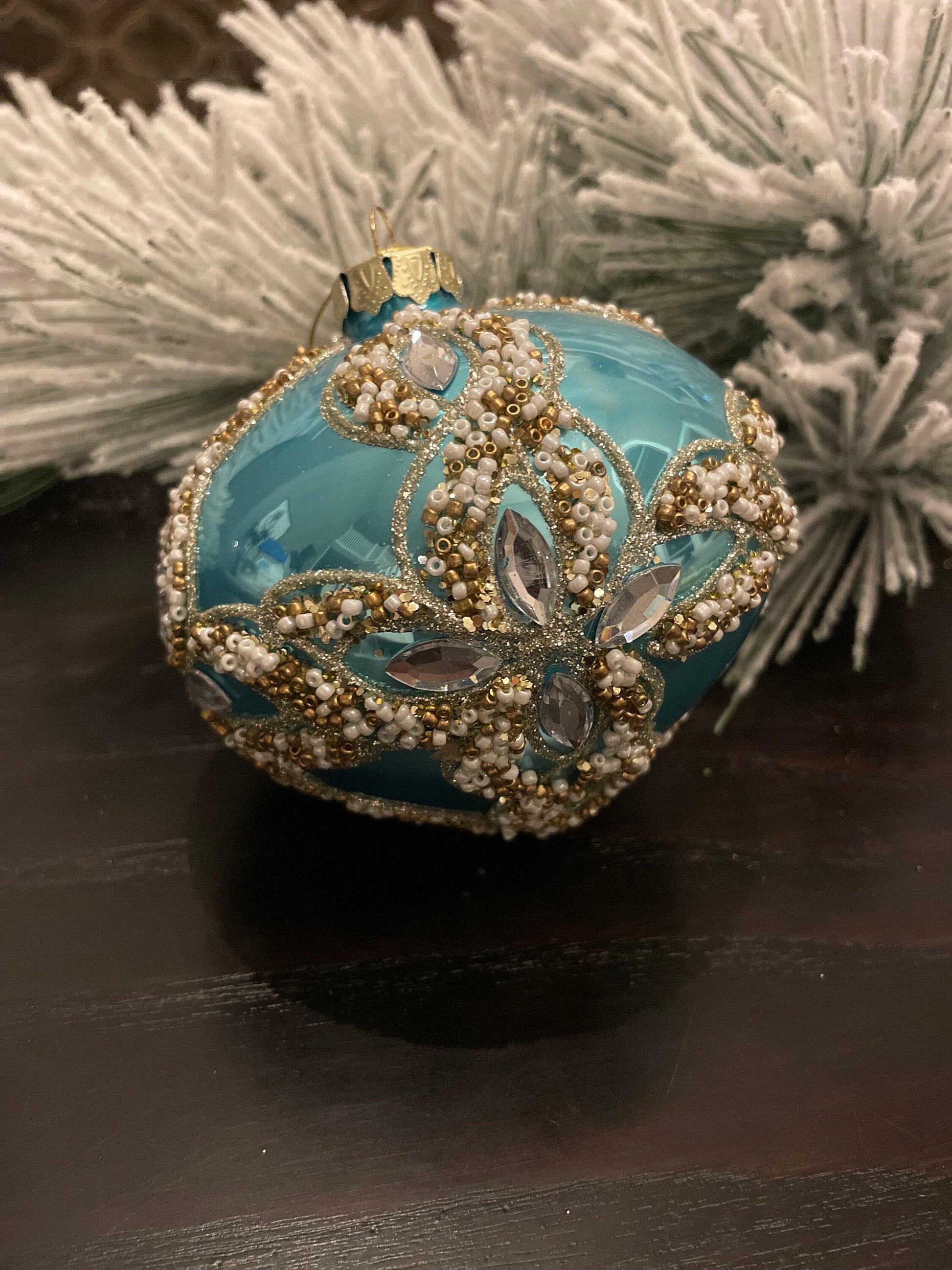 Set of 2. 4” glass beaded jewel trinity onion ornament. Aqua and silver.