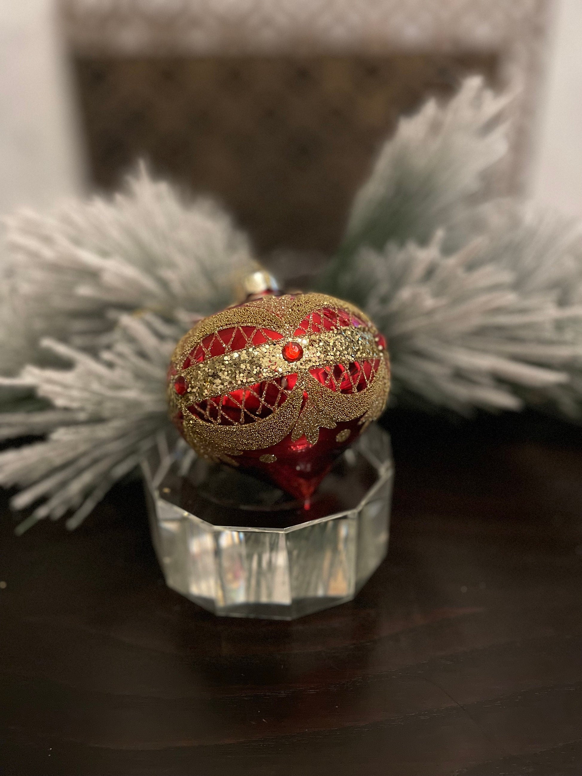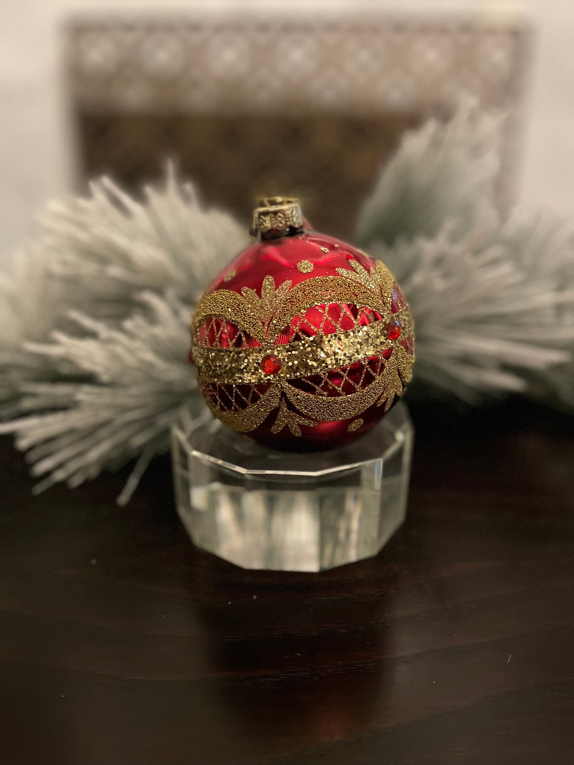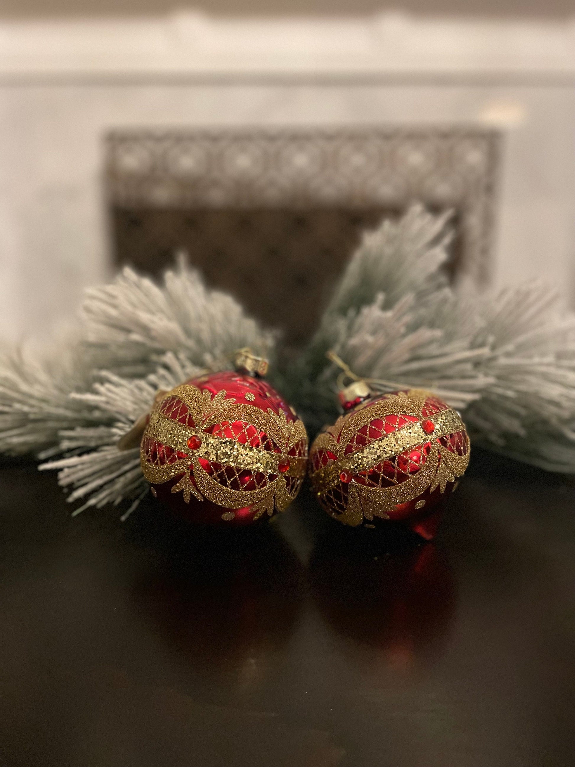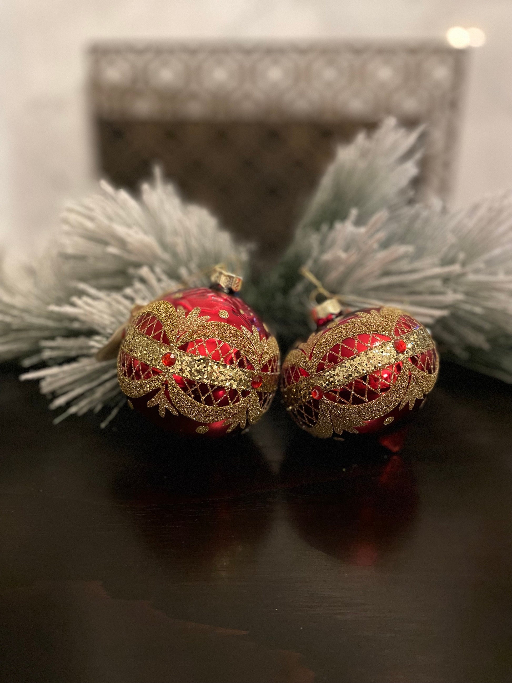 Set of 2. 4" Glass garland draped ball and finial ornament. Red and gold.