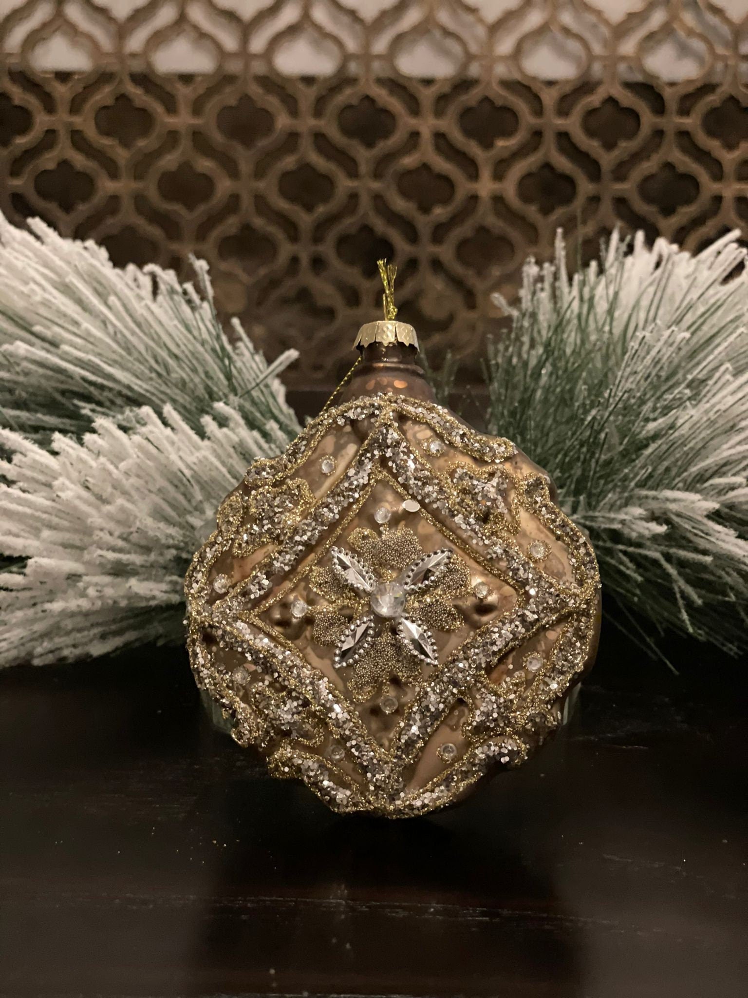 Set of 2. 4” Glass jewel encrusted floret disc ornament. Gold and silver.