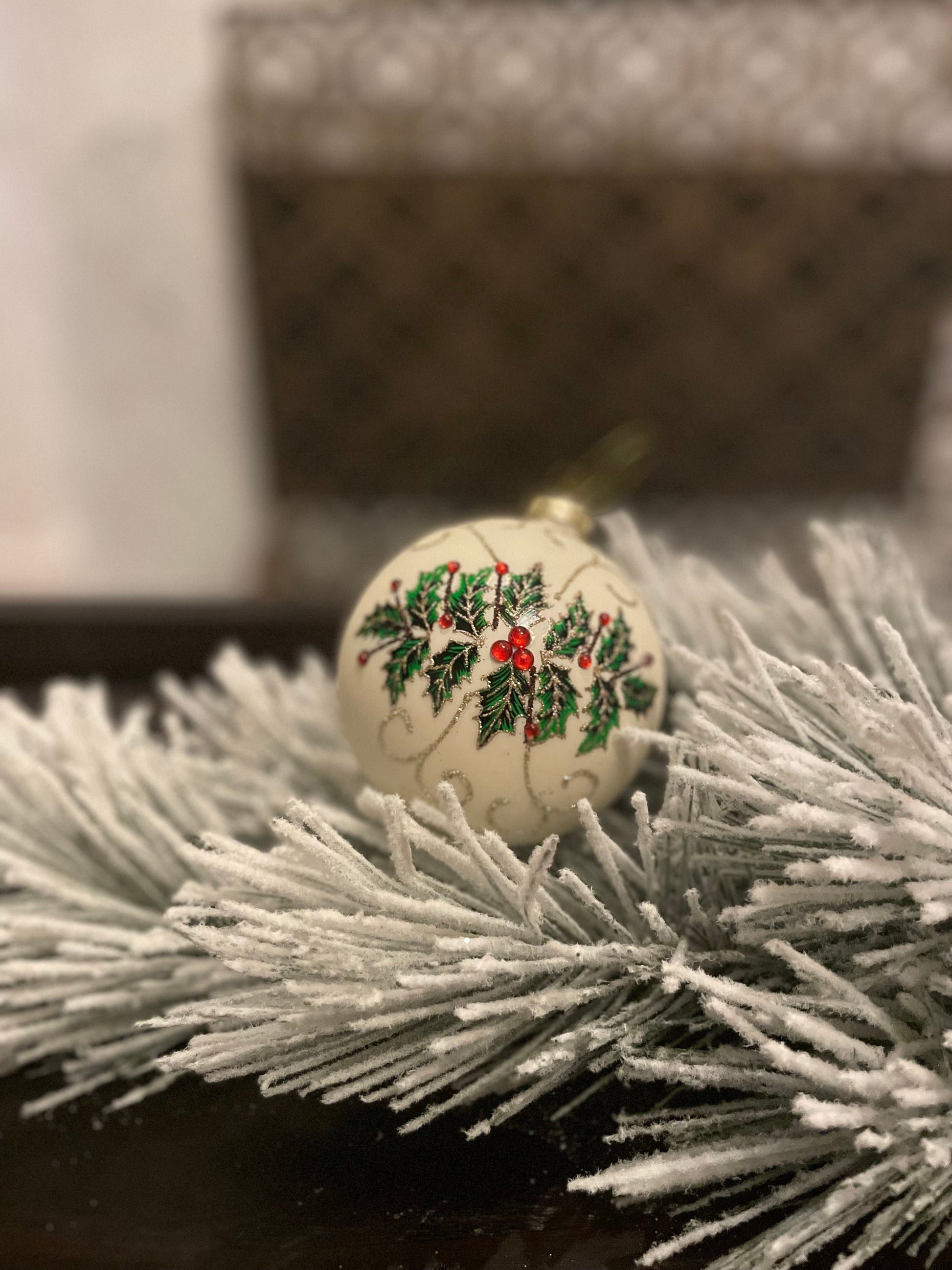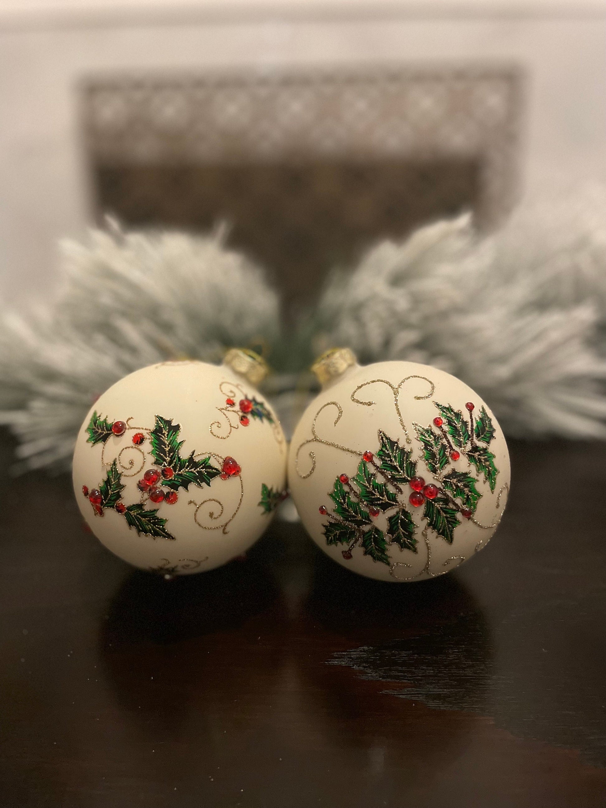 Set of 2. 4" Glass jewel holly vine ball ornament.