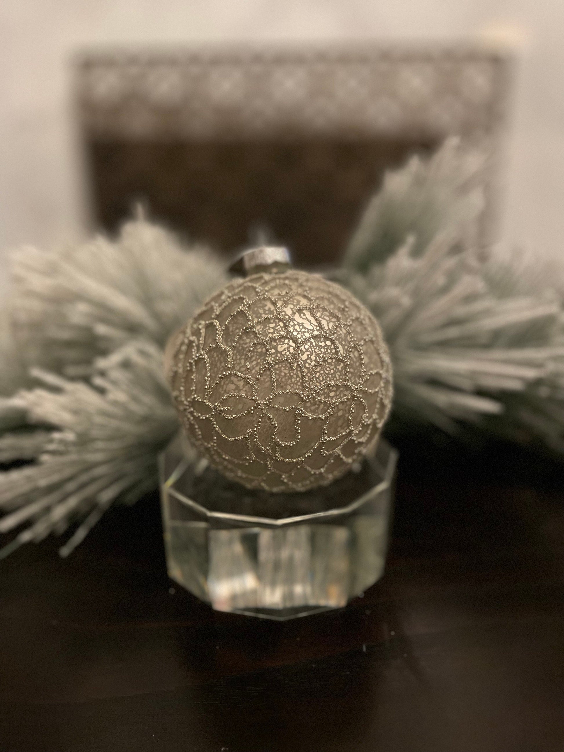 Set of 2. 4" Glass mercury crystal ball ornament. Platinum.