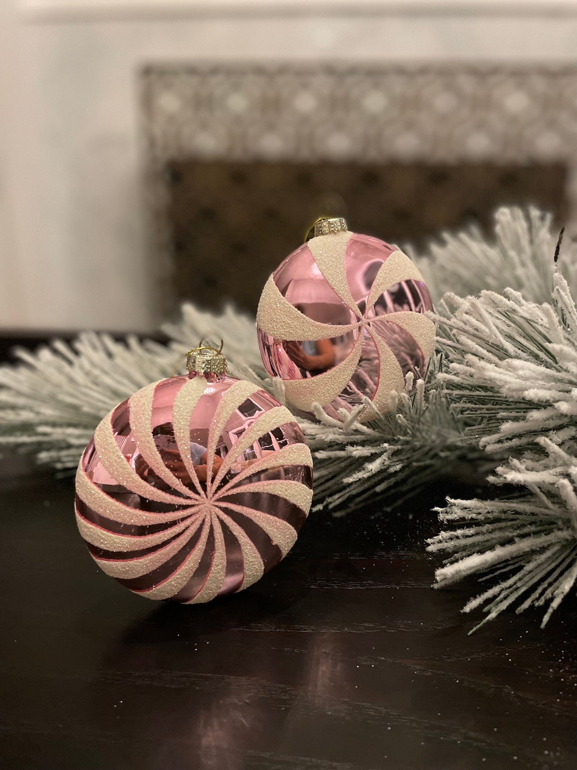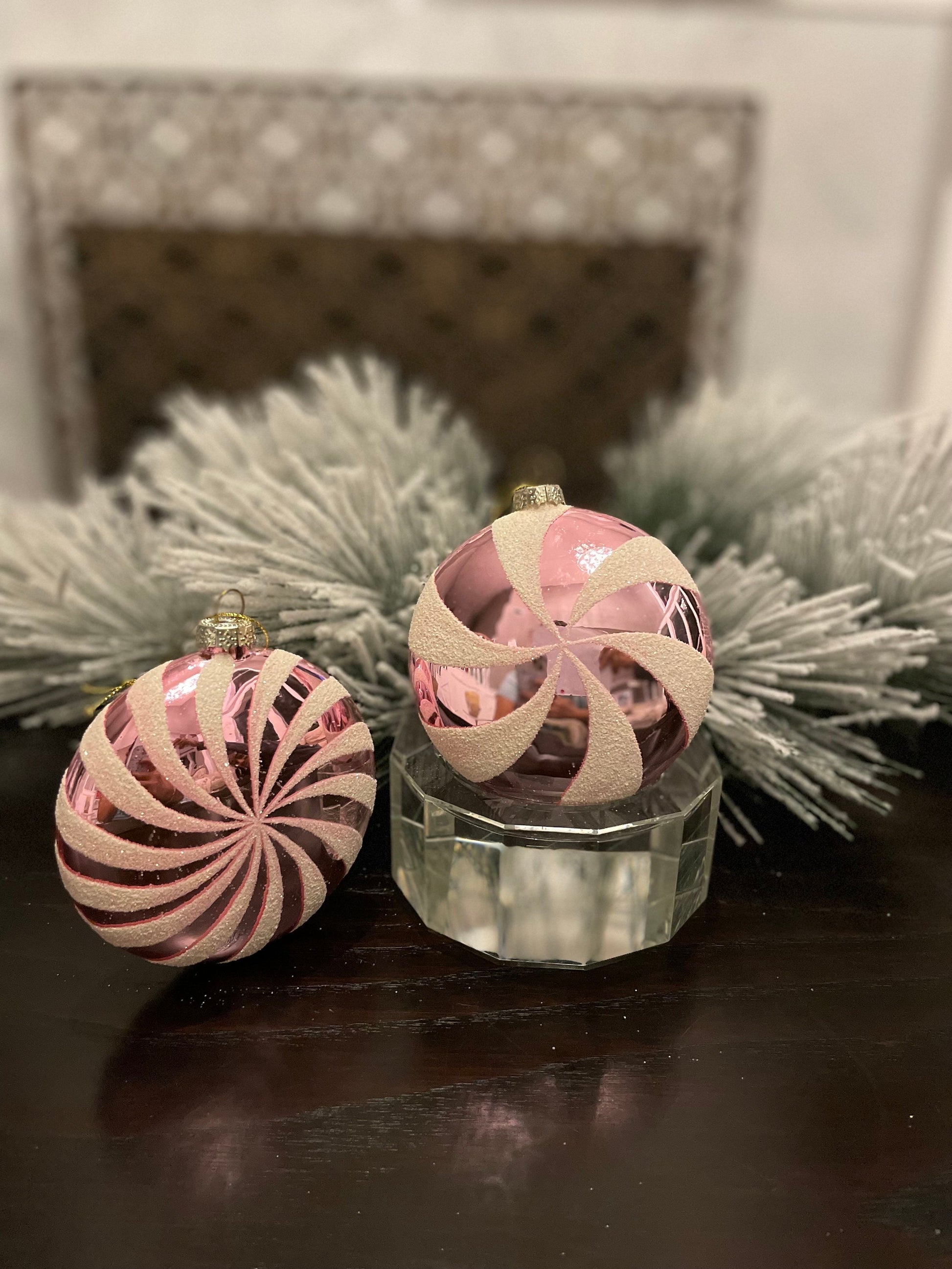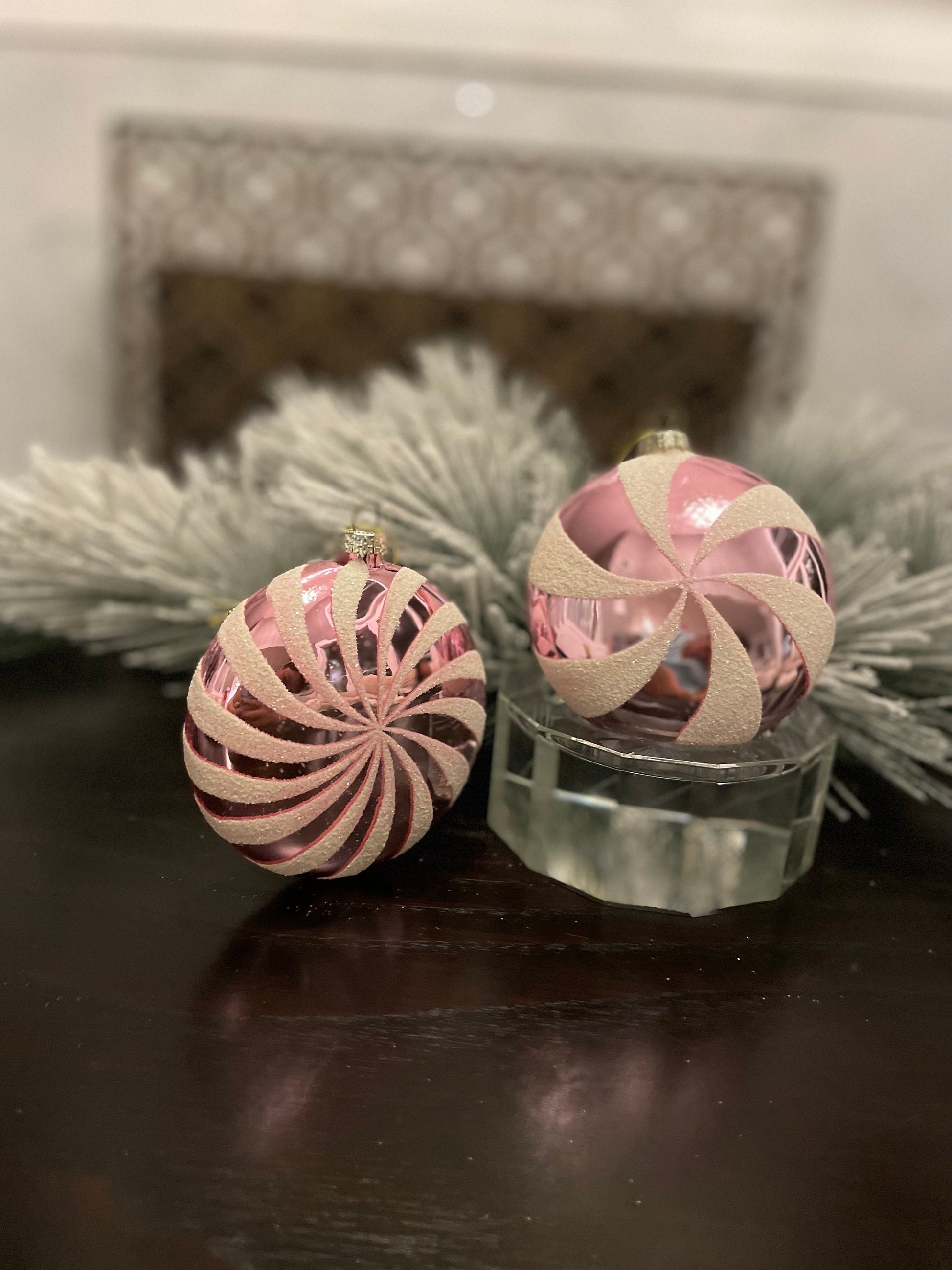 Set of 2. 4" glass peppermint candy disk ornament. Pink and white.