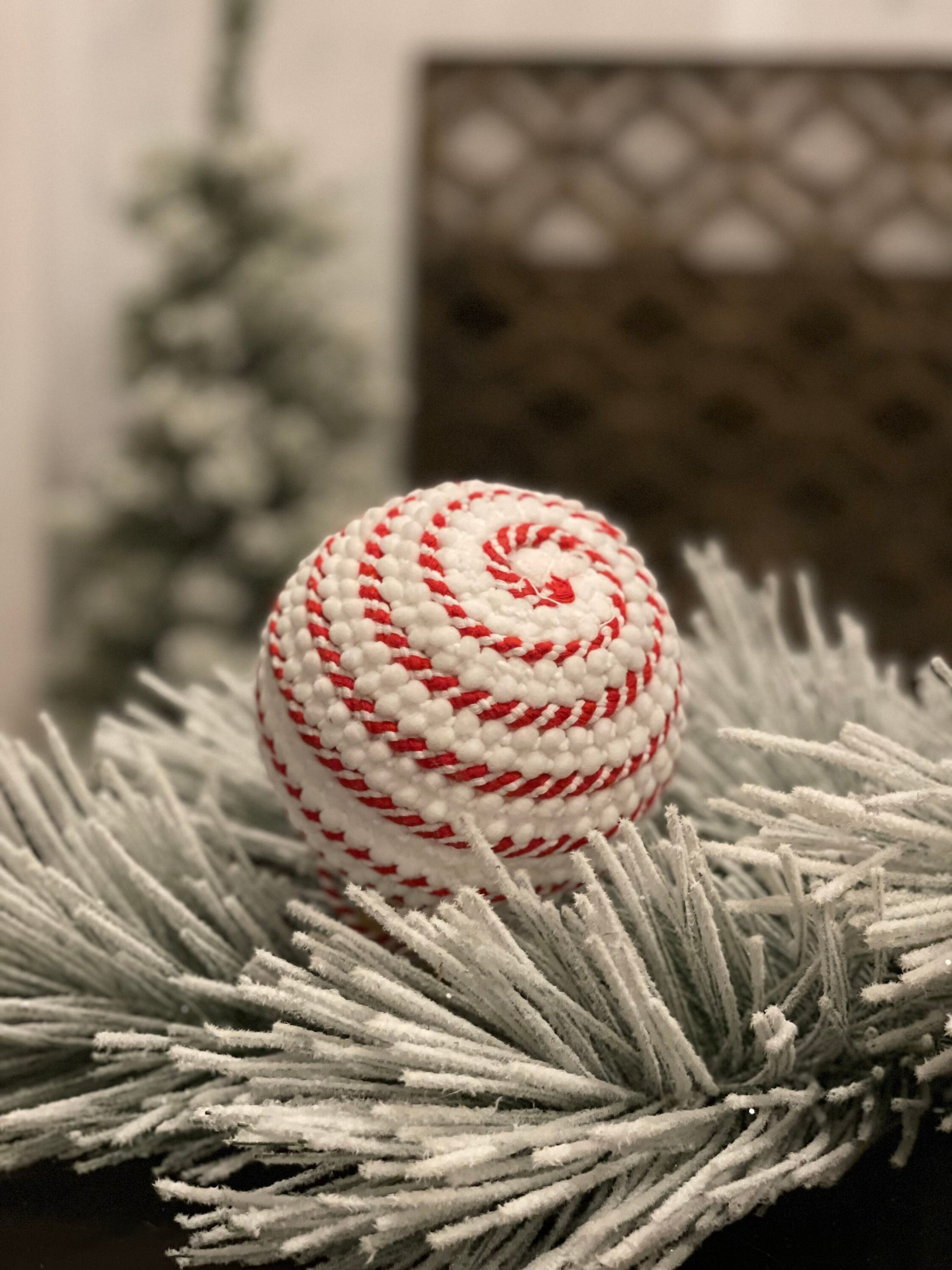 SET of 2. 4" Swirl cord ball ornament. Red and white.