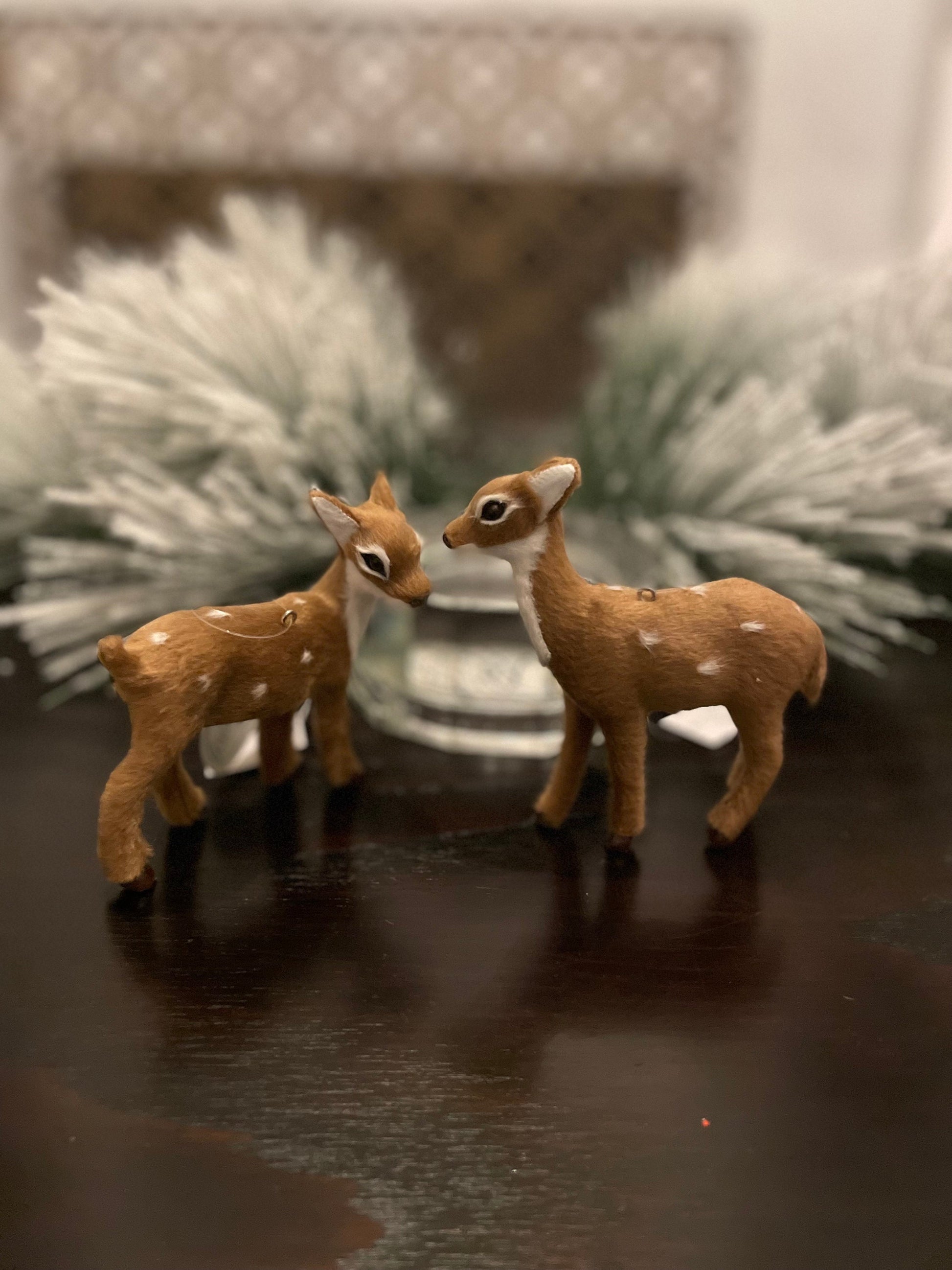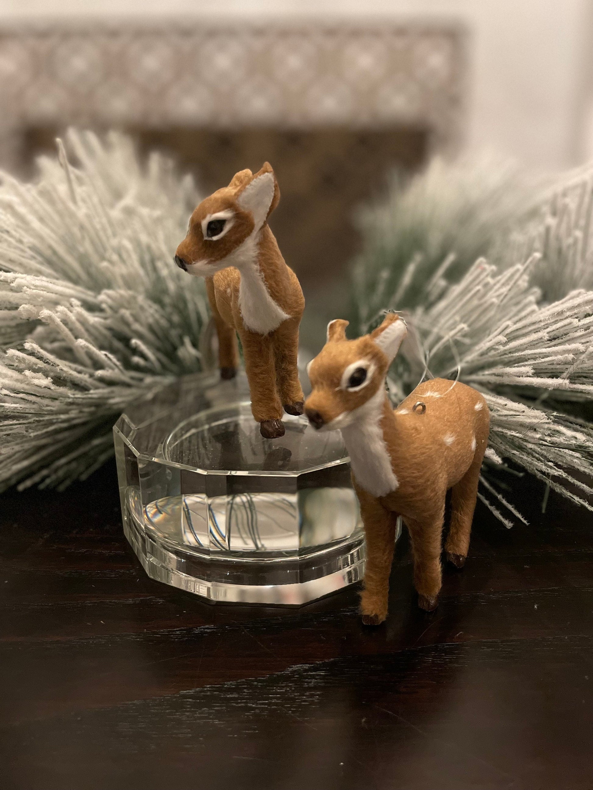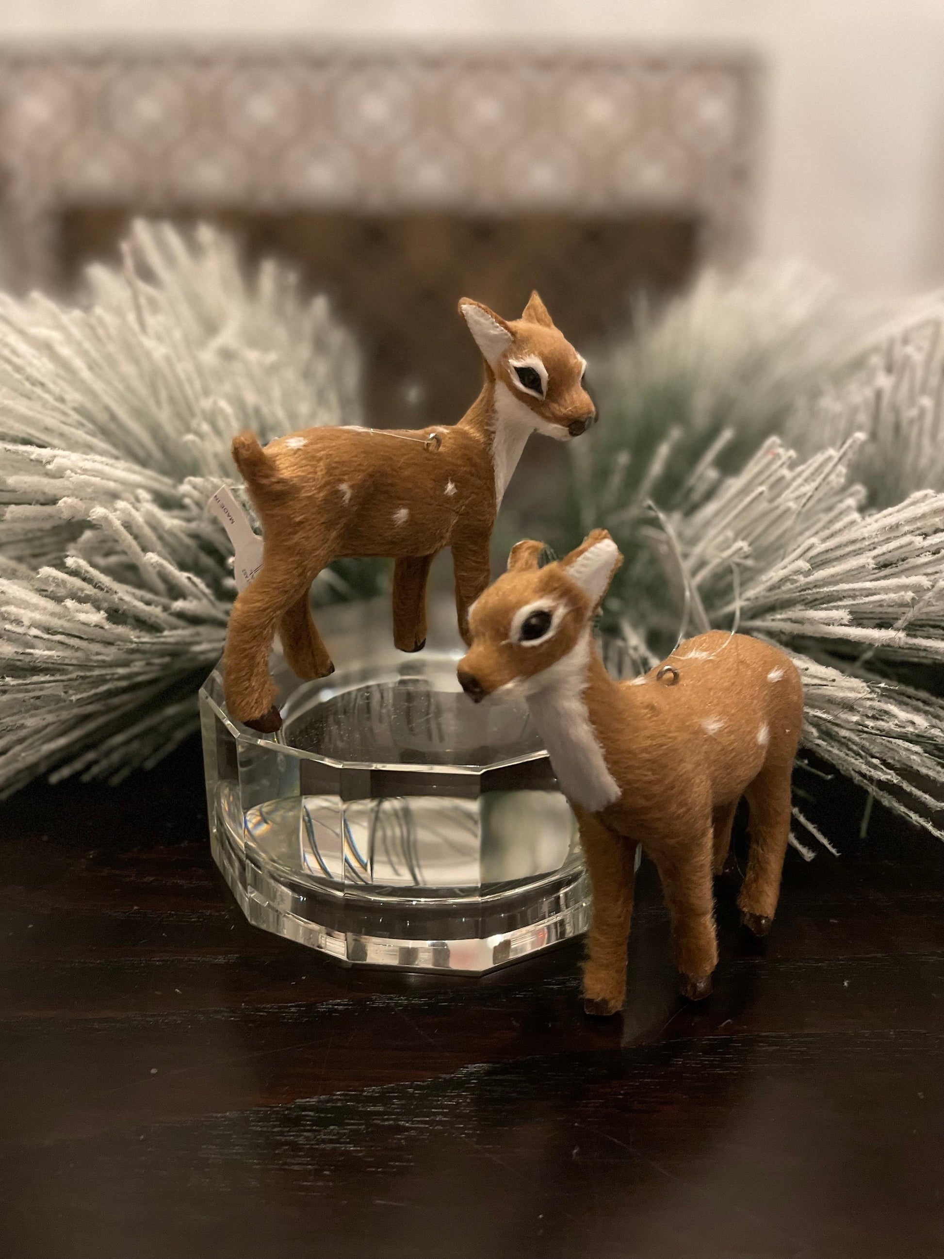 Set of 2. 5” furry fawn ornament. Forest animal.
