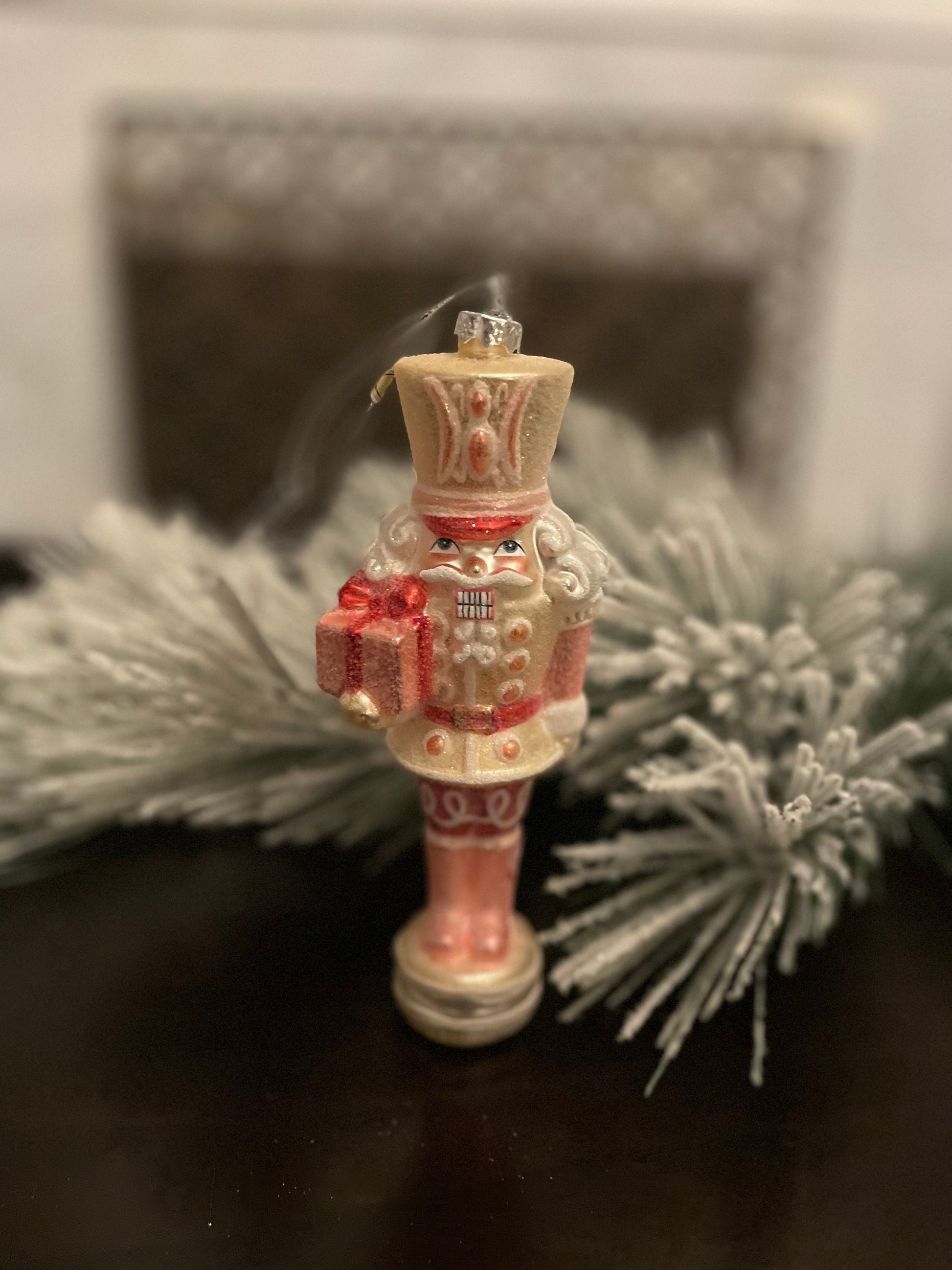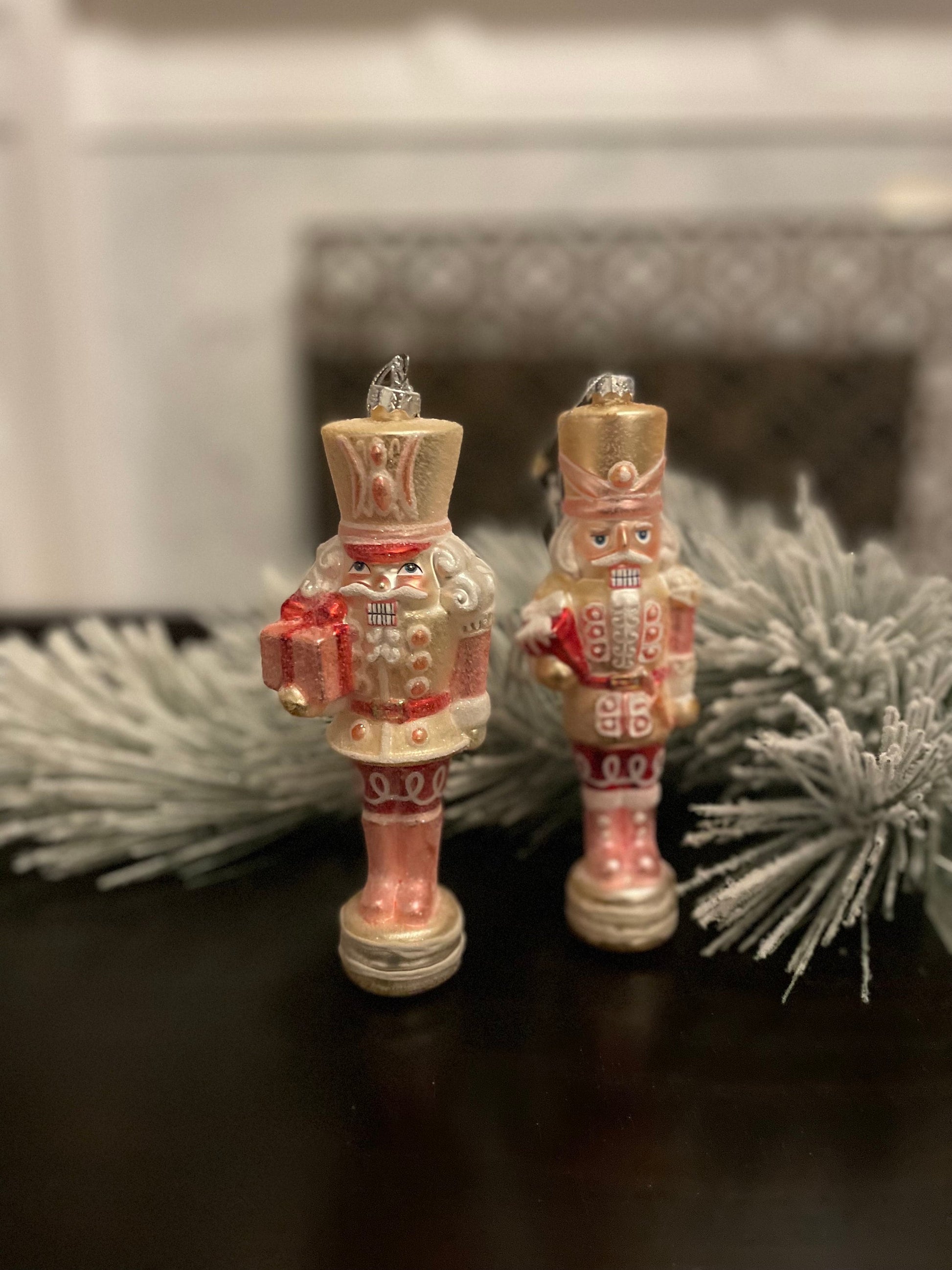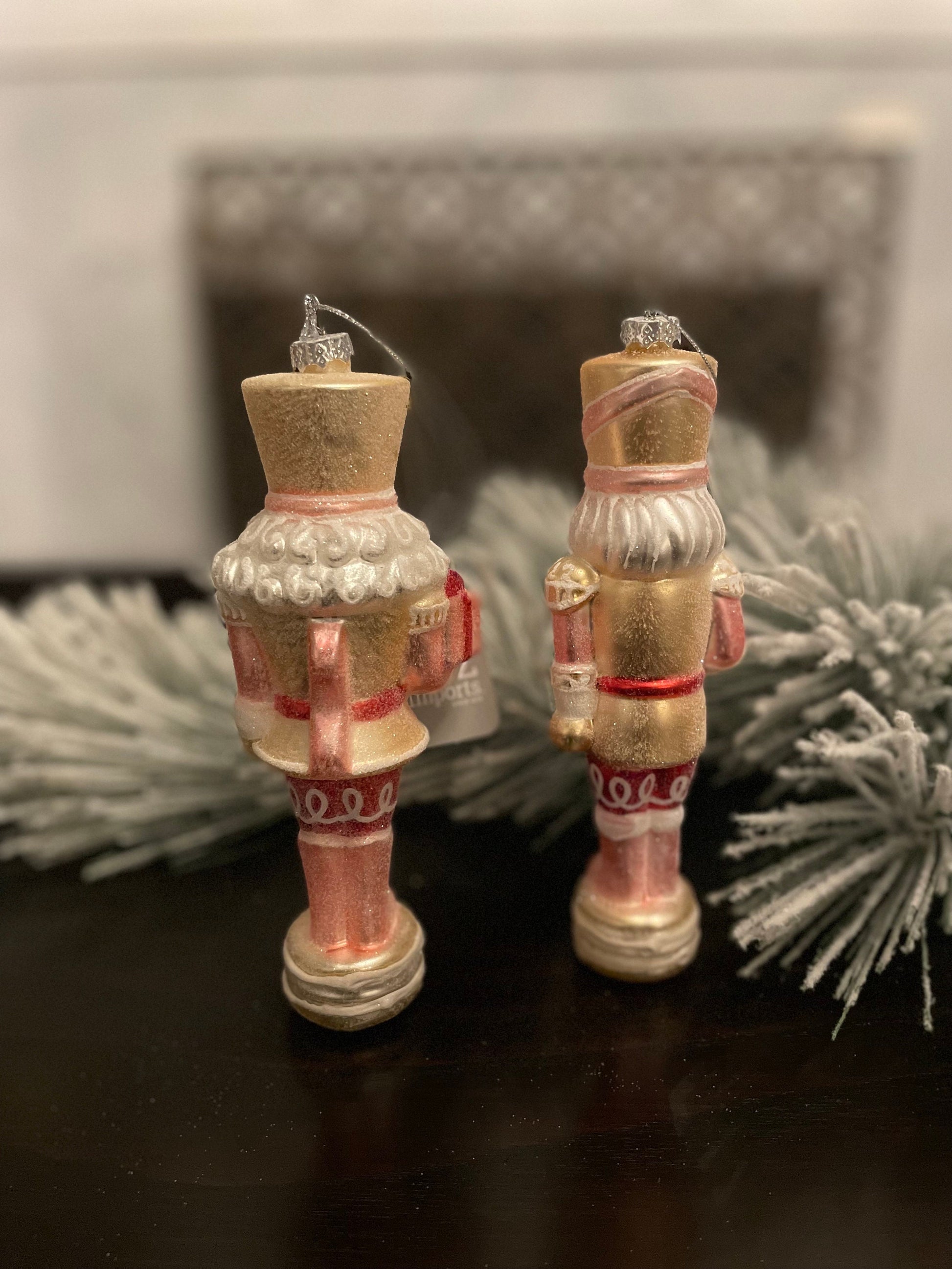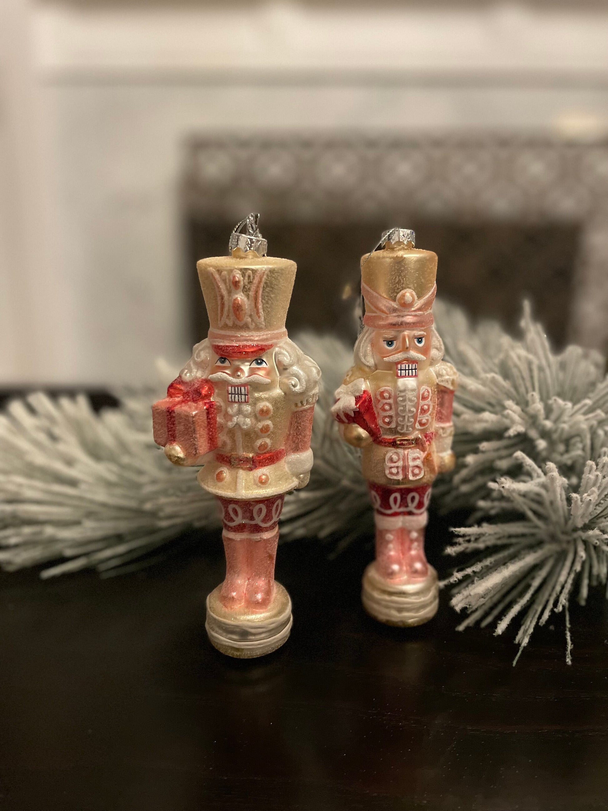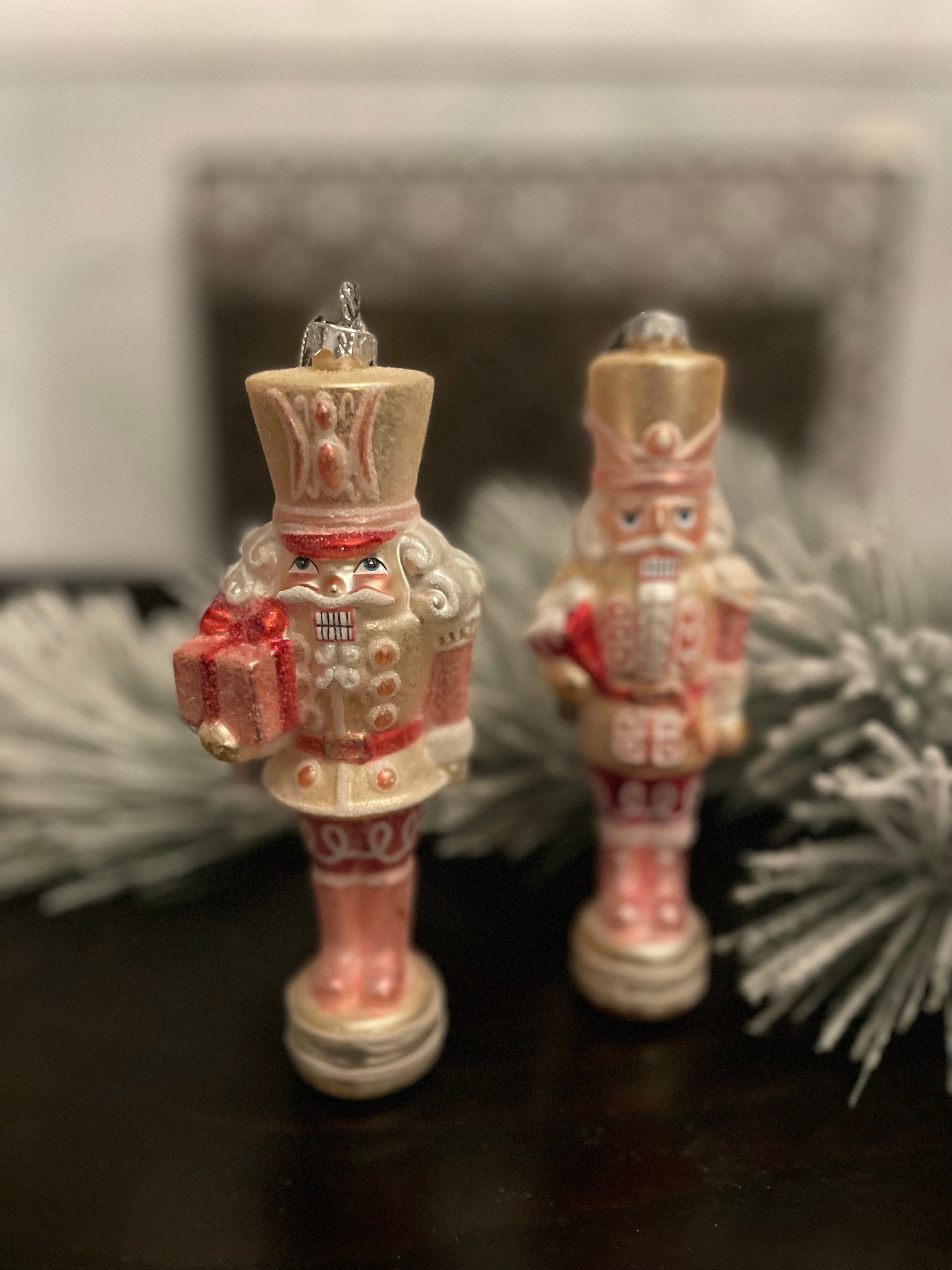 Set of 2. 8” Glittered nutcracker ornament. Pink. Glass.