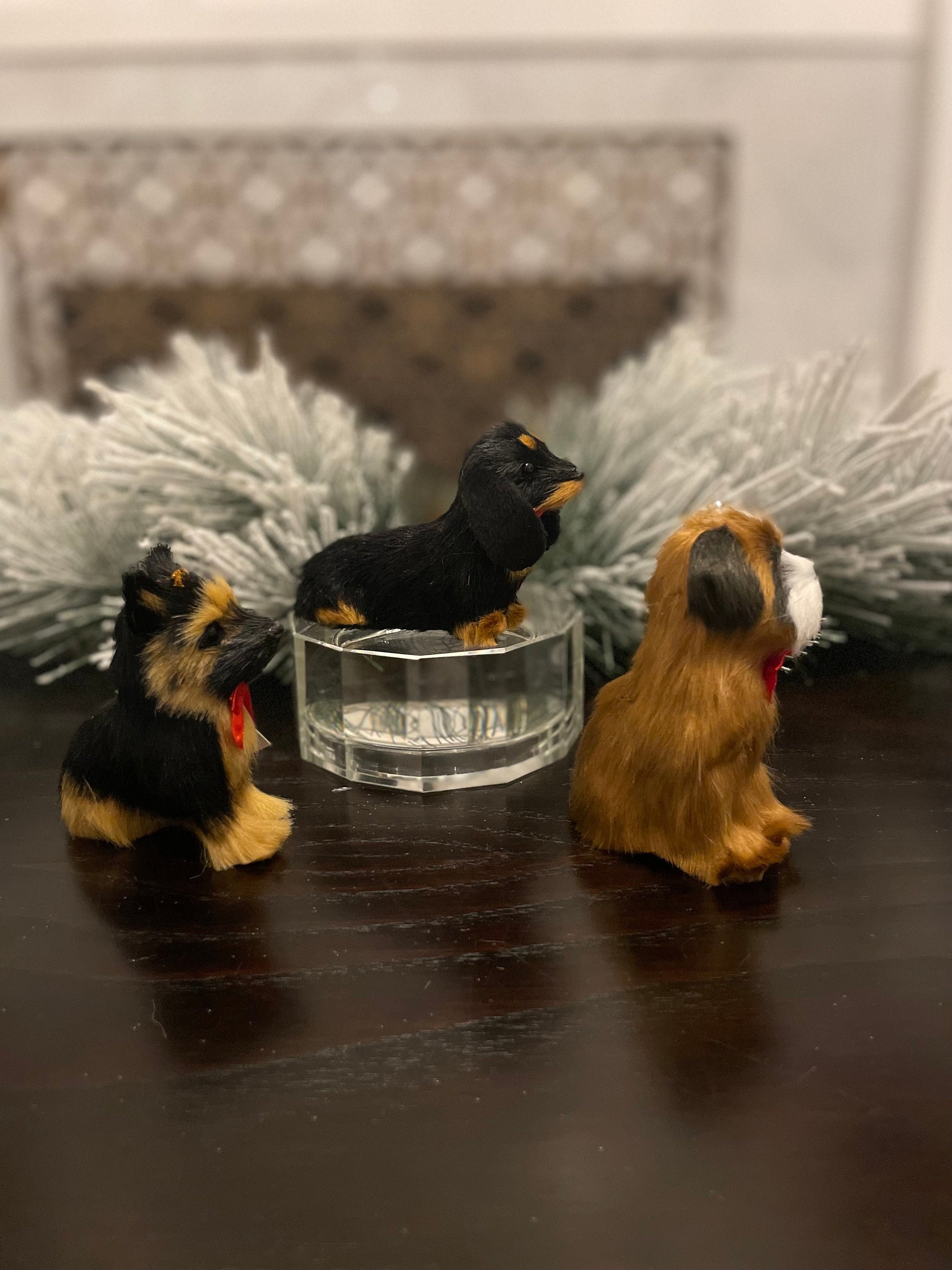 Set of 3. 4”-3” faux fur dog, Christmas dog ornament.