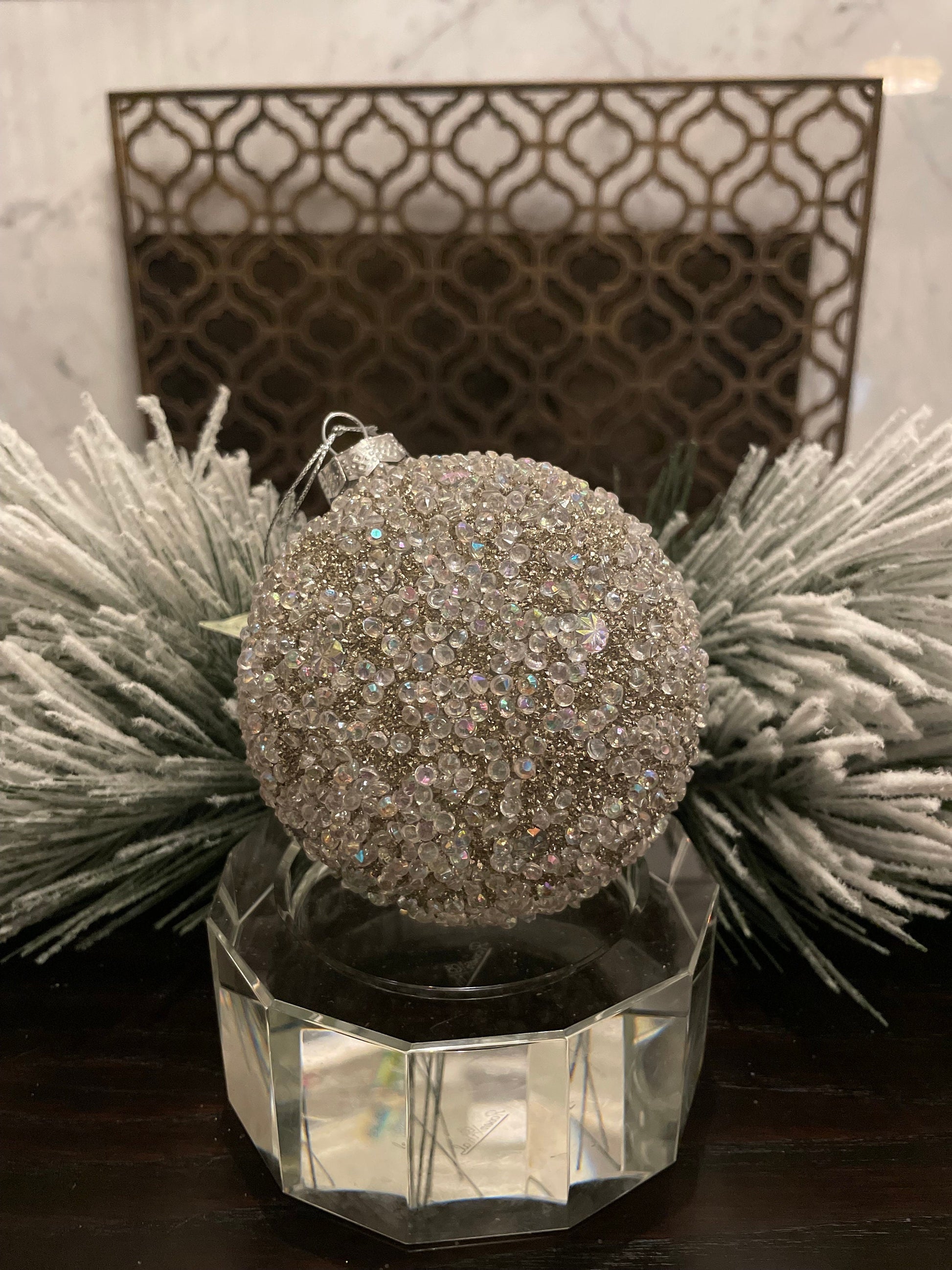 Set of 3. 4" mercury glass with ice ball ornament. Platinum.