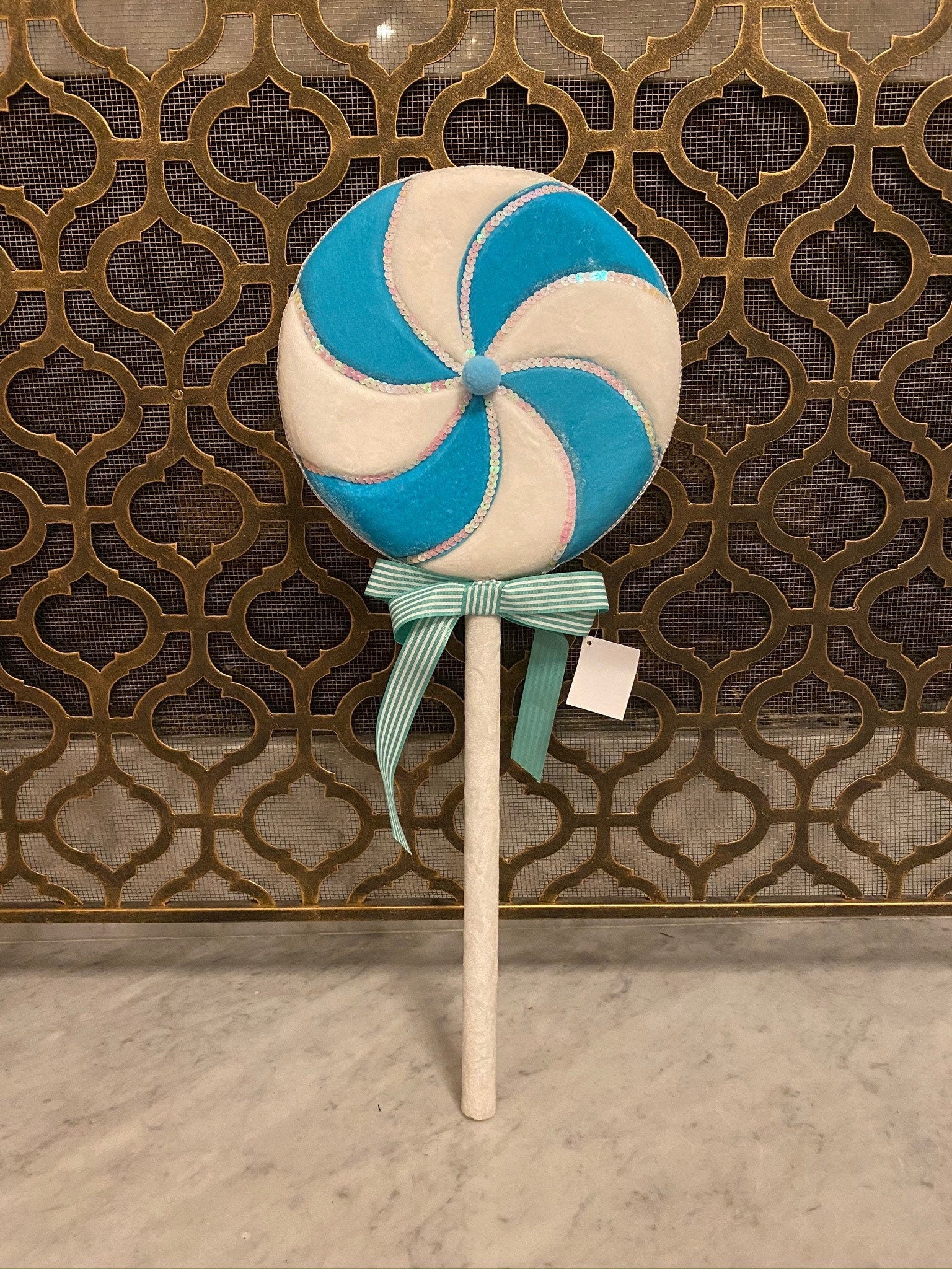 Lollipop 28 inch tall and 10” wide blue and white velvet with a blue and white bow. Very light weight. It is a beautiful christmas ornament. You can use it in your tree, wreath, garland or anywhere you like.