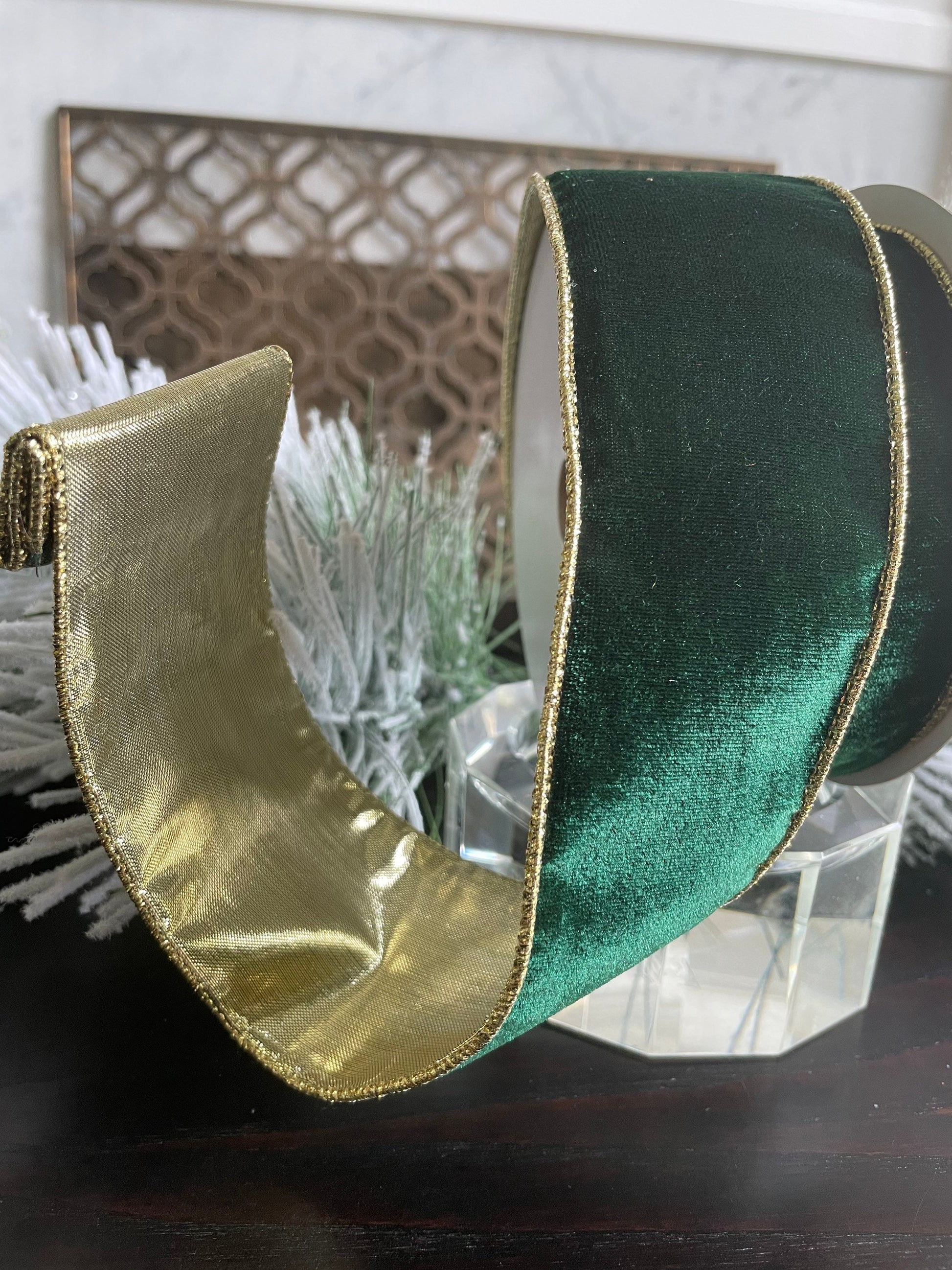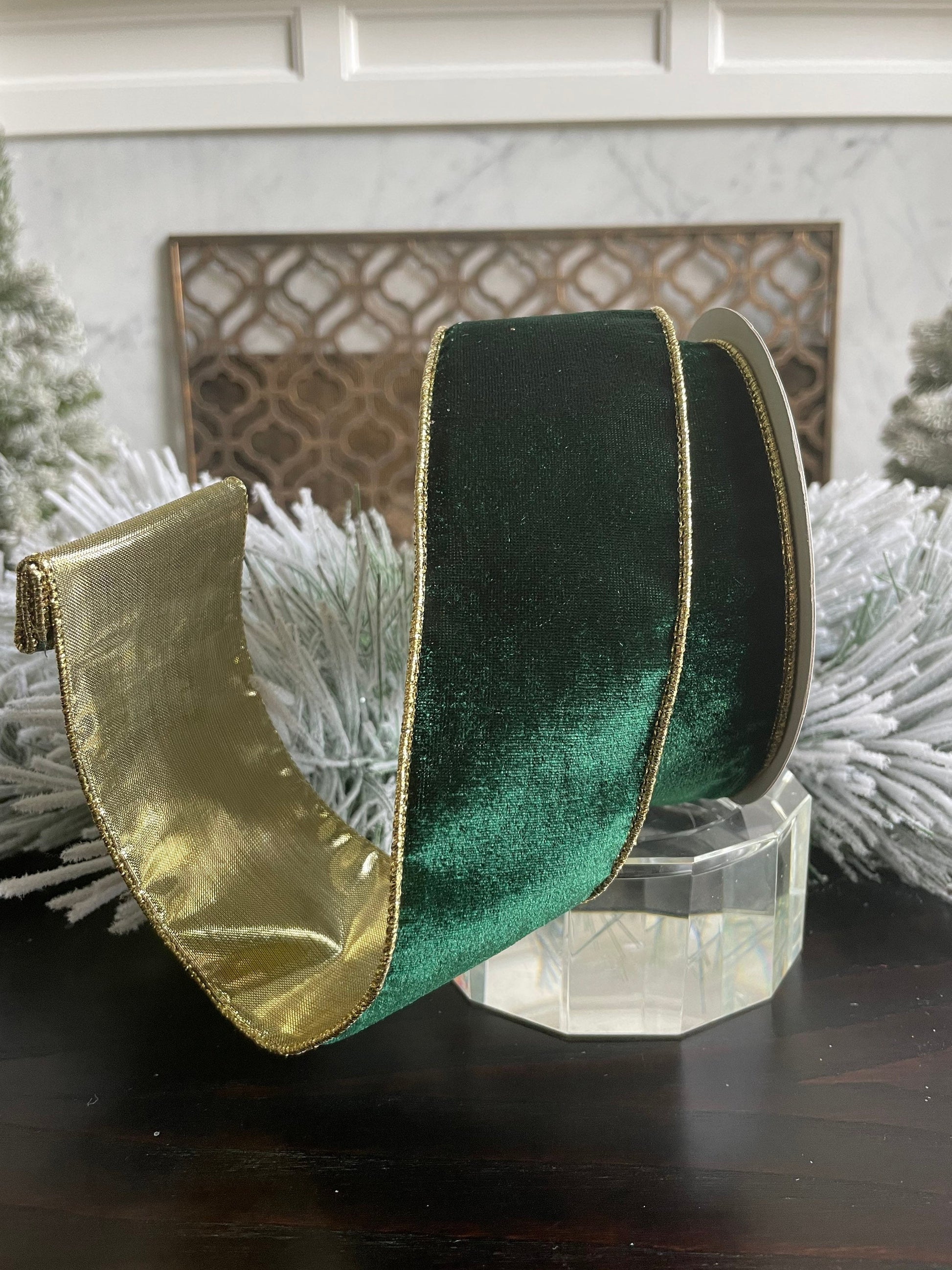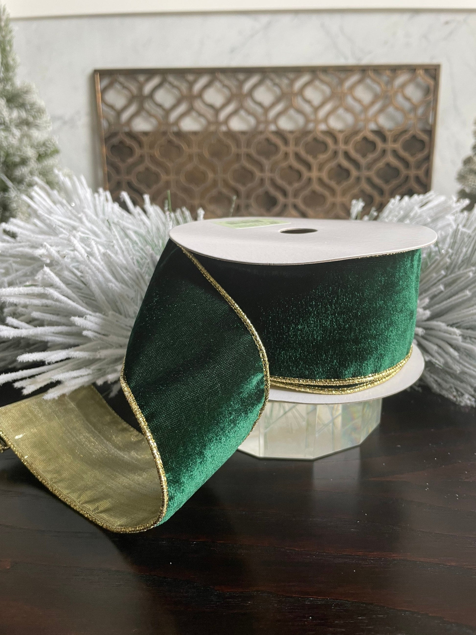 velvet emerald ribbon with gold back. Emerald and gold. 2.5”x 10 yards. Wired. Green, emerald, hunter green.
