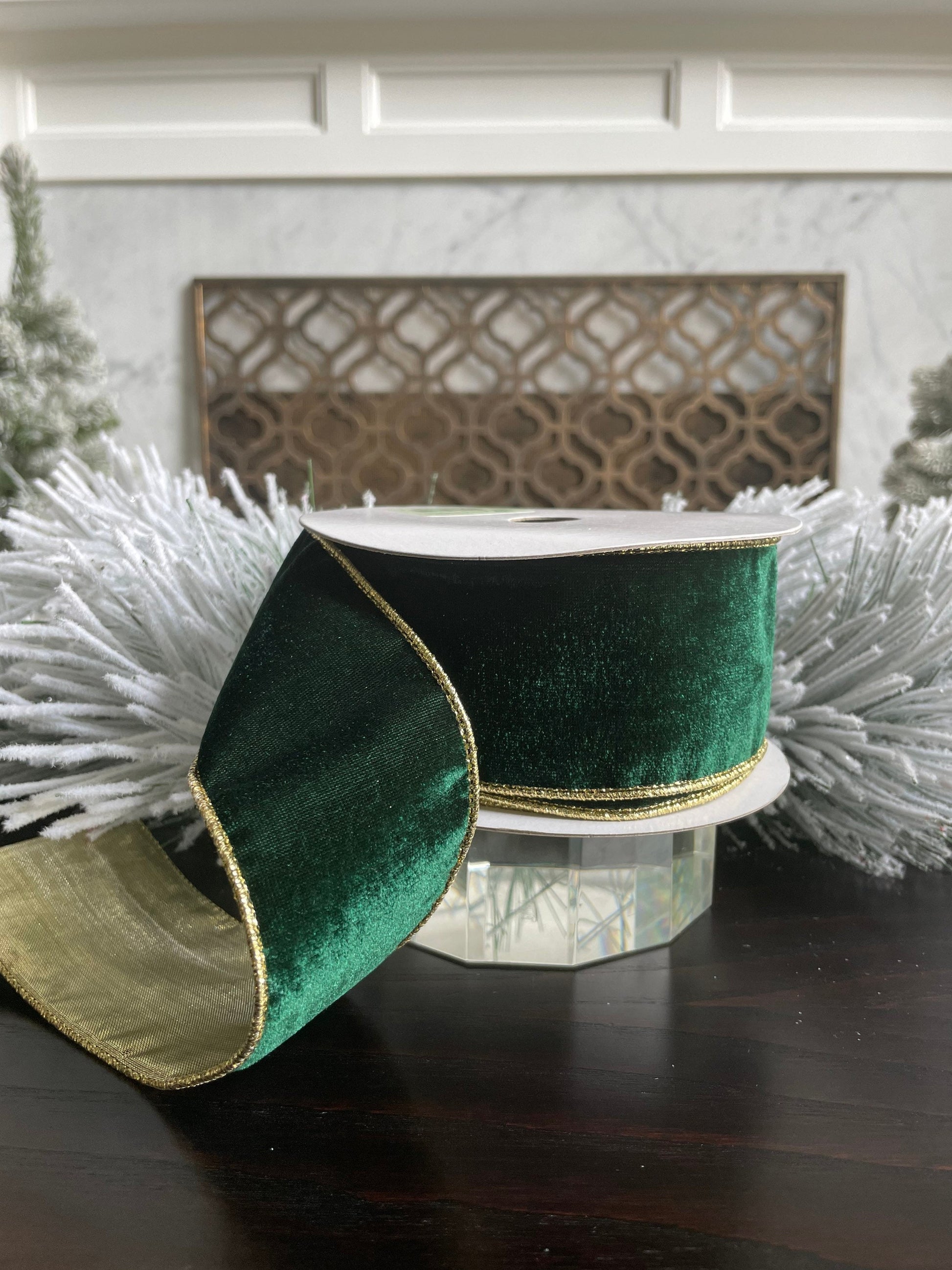 velvet emerald ribbon with gold back. Emerald and gold. 2.5”x 10 yards. Wired.*