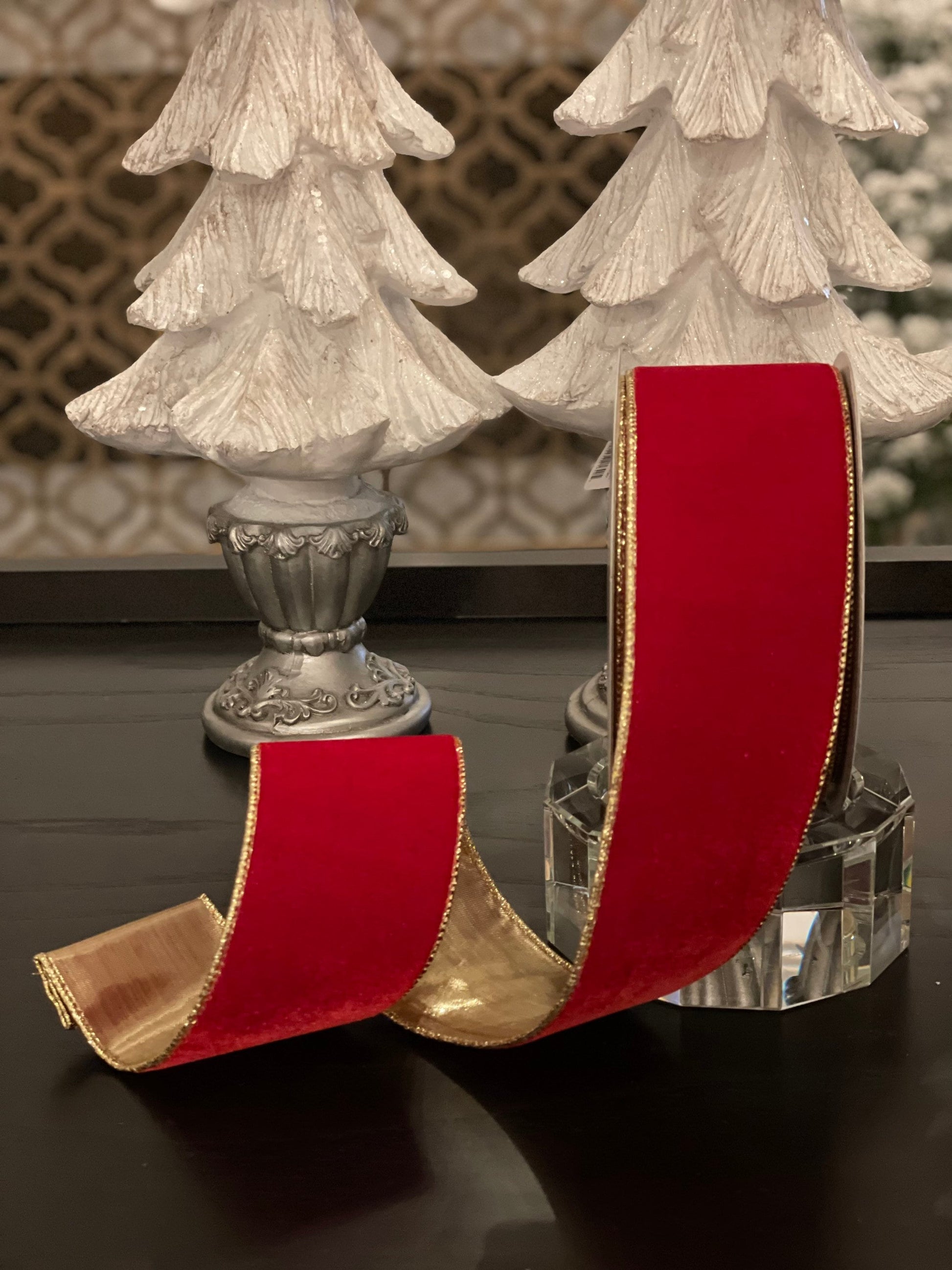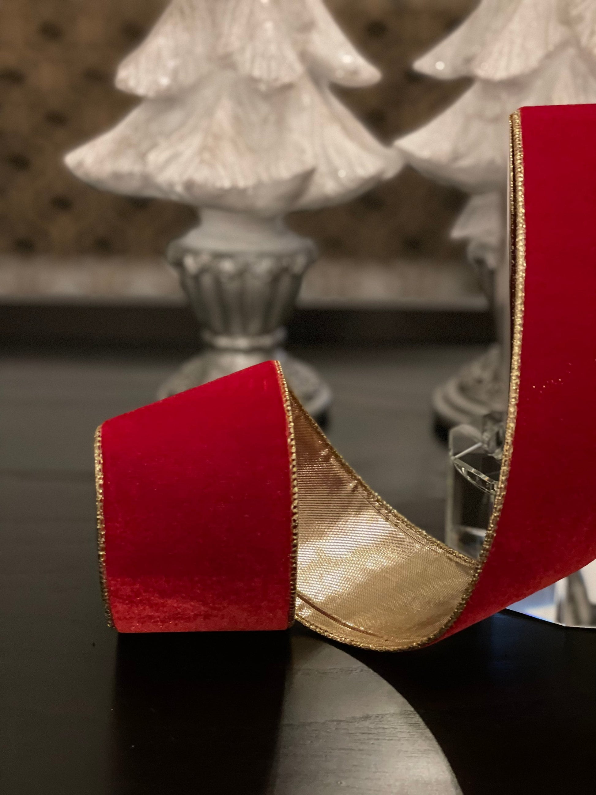 velvet red ribbon with gold back. Red and gold. 2.5”x 10 yards. Wired.